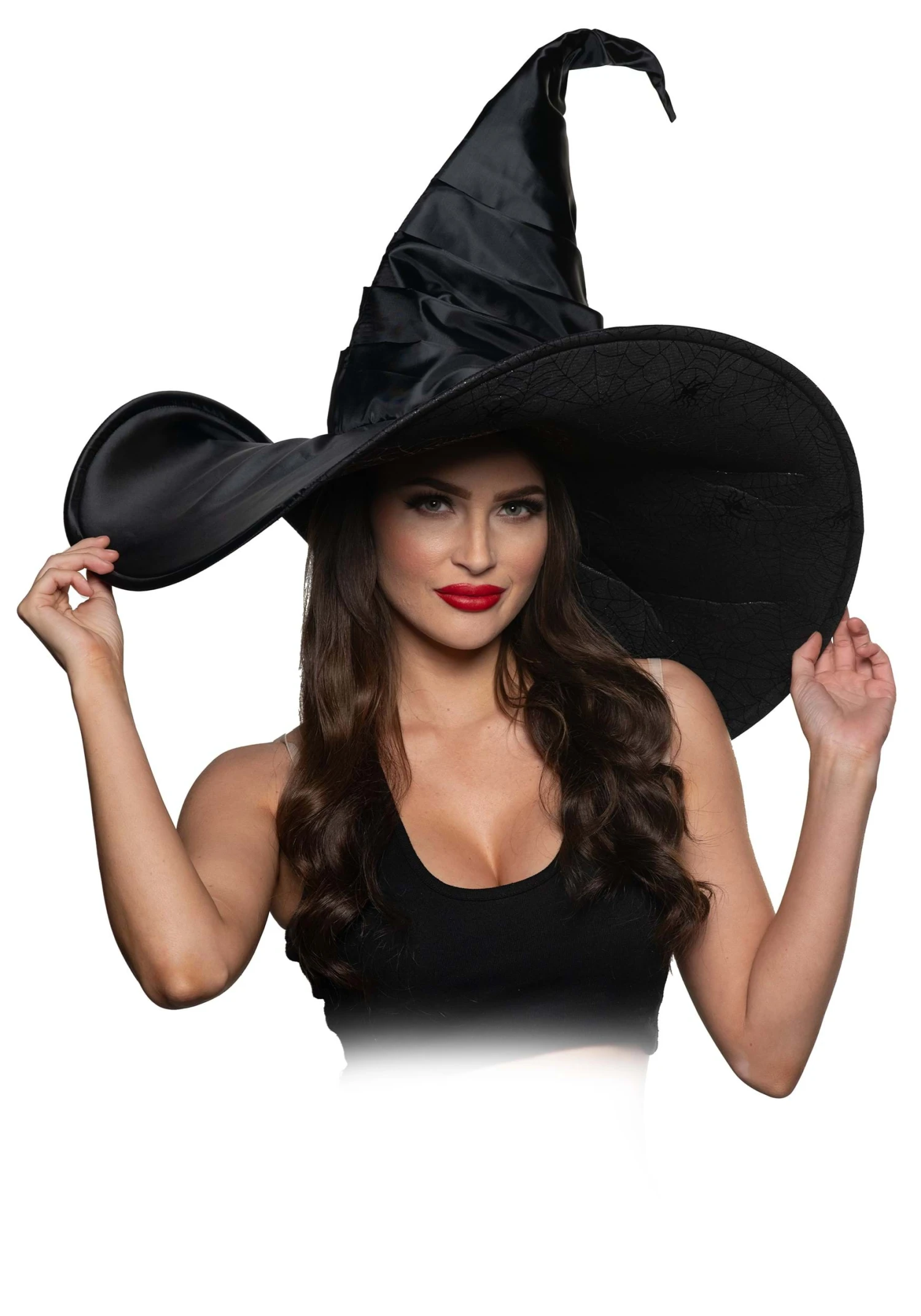 This towering witch hat stands tall with its signature pointed top, while shiny satin layers wrap elegantly around the hat and brim. The oversized brim makes a statement of its own, offering flexibility so you can adjust the shape to match your mood—bent and mysterious, or wide and commanding. Flip it over, and you’ll discover an intricate spiderweb texture on the underside, a spooky yet stylish touch to enchant onlookers from every angle.