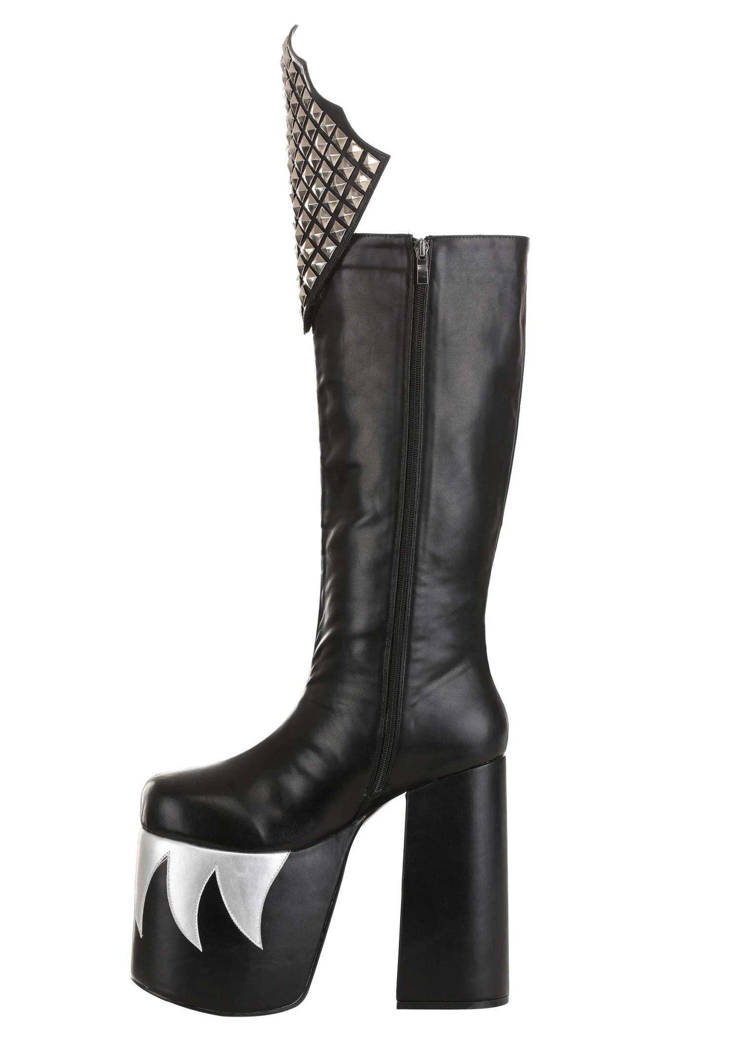 These officially licensed boots are a Made By Us design inspired by the boots worn by the legendary frontman of KISS, Gene Simmons. The boots are made out of a black vinyl material and fit with a zipper along the side of the boot. The platform-style heels help give you some extra height on stage and the silver vinyl accents make you loo like a true rock demon! rounding out the whole look, is a panel of metal studs on top. Just pair these up with your Demon costume and you’ll be ready to rock like the legend!