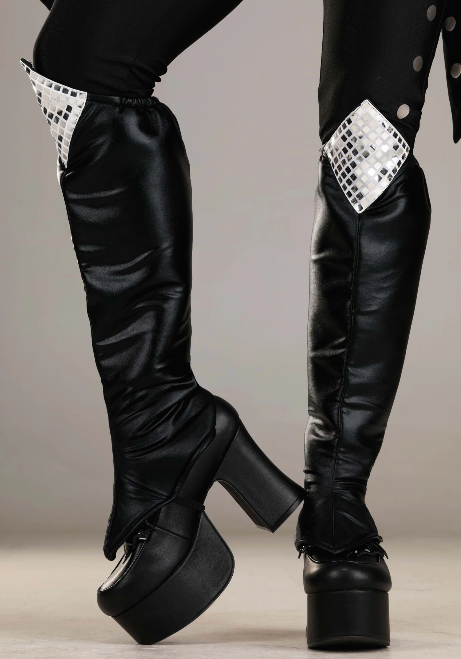 - Foam backed boot covers have metallic foil disco ball mirror fabric, elastic bands secure under shoes