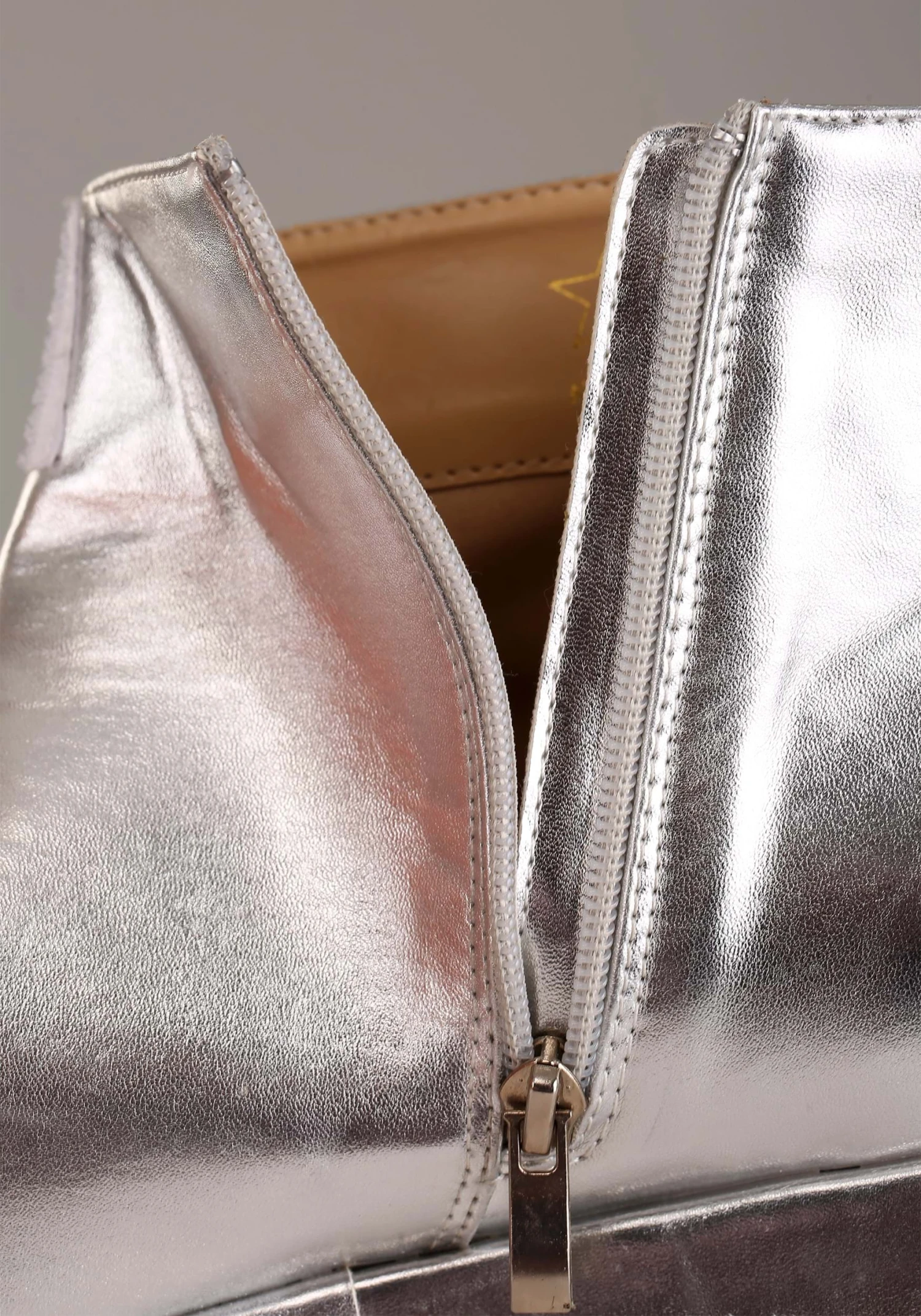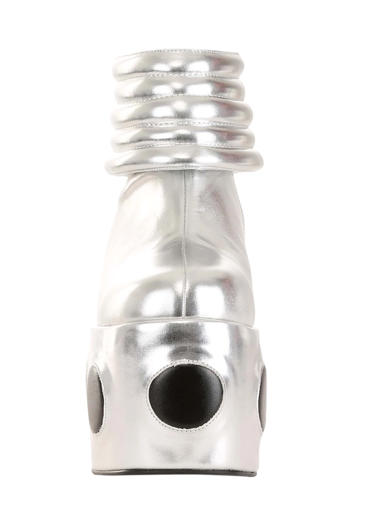 - Smooth silver platform vinyl boots, polyfill black circle design