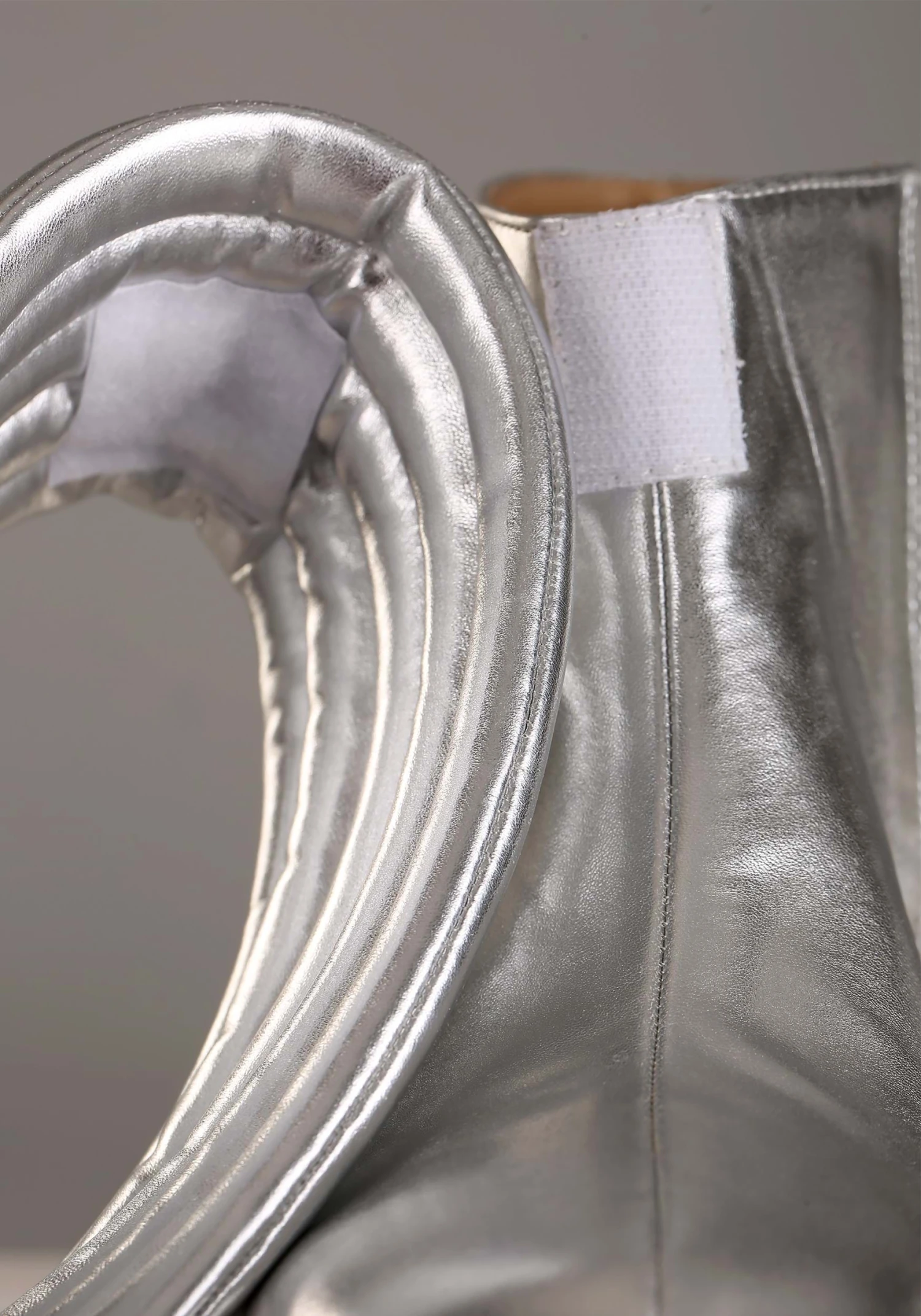 Whether you want to add some flair to your next show or you want to become the legendary guitarist from KISS, this pair of KISS Spaceman Boots will have you ready to rock. The boots have zippers for fitting and are completely covered in a shimmering metallic silver sheen. The high platform bottoms give you extra height and the top features a cuff that makes them look like boots that came straight from the moon! They also pair perfectly with our officially licensed KISS costumes, so you can get the full Spaceman experience!