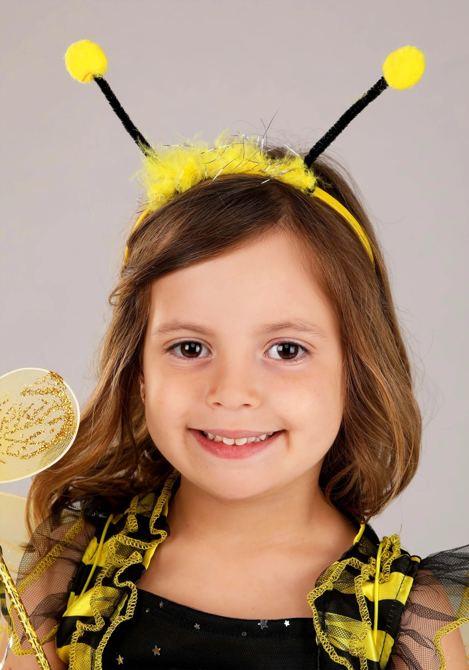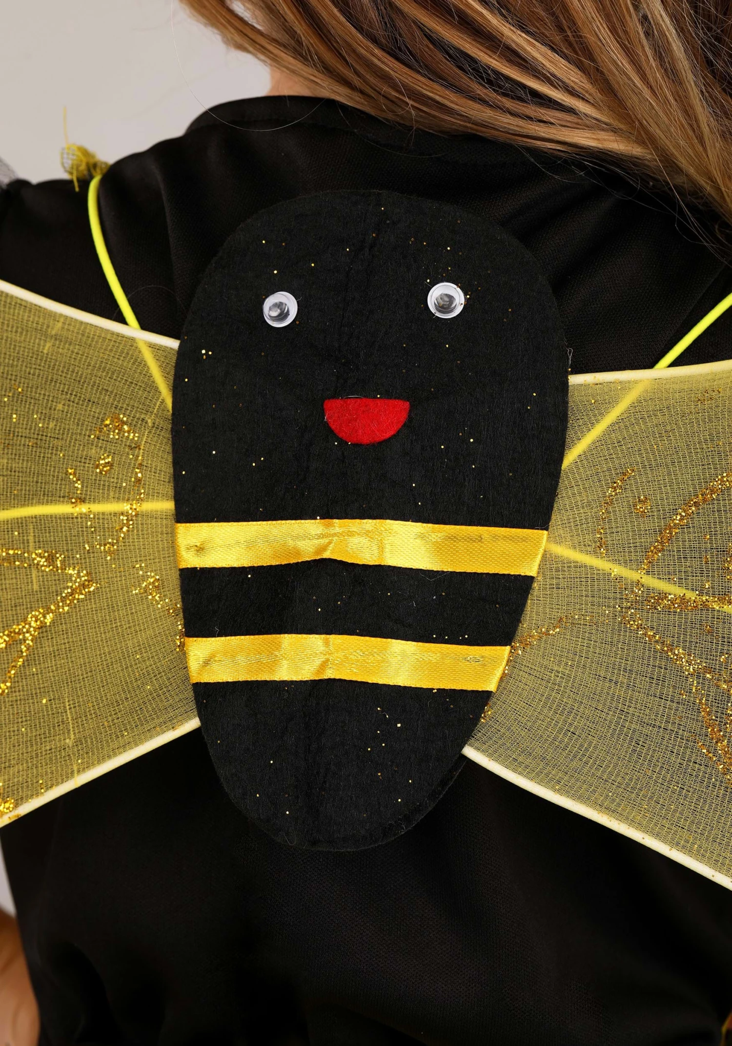 - Nylon wings with wire have glitter graphics, felt bee body has plastic eyes, elastic shoulder straps