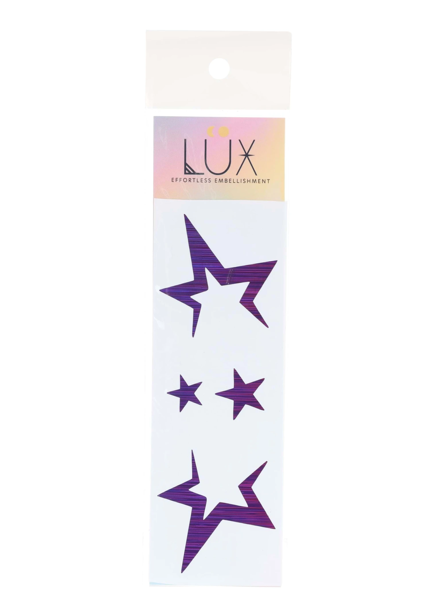 You’ll feel like a superstar when you wear these fun JamStar Holographic Purple Sparkle Face Decals! The set of four facial stickers are made of iridescent purple vinyl and backed with non-toxic adhesive. Simply stick them where you want them and peel them off when finished. If treated with care and replaced on their original backing, the decals are reusable!