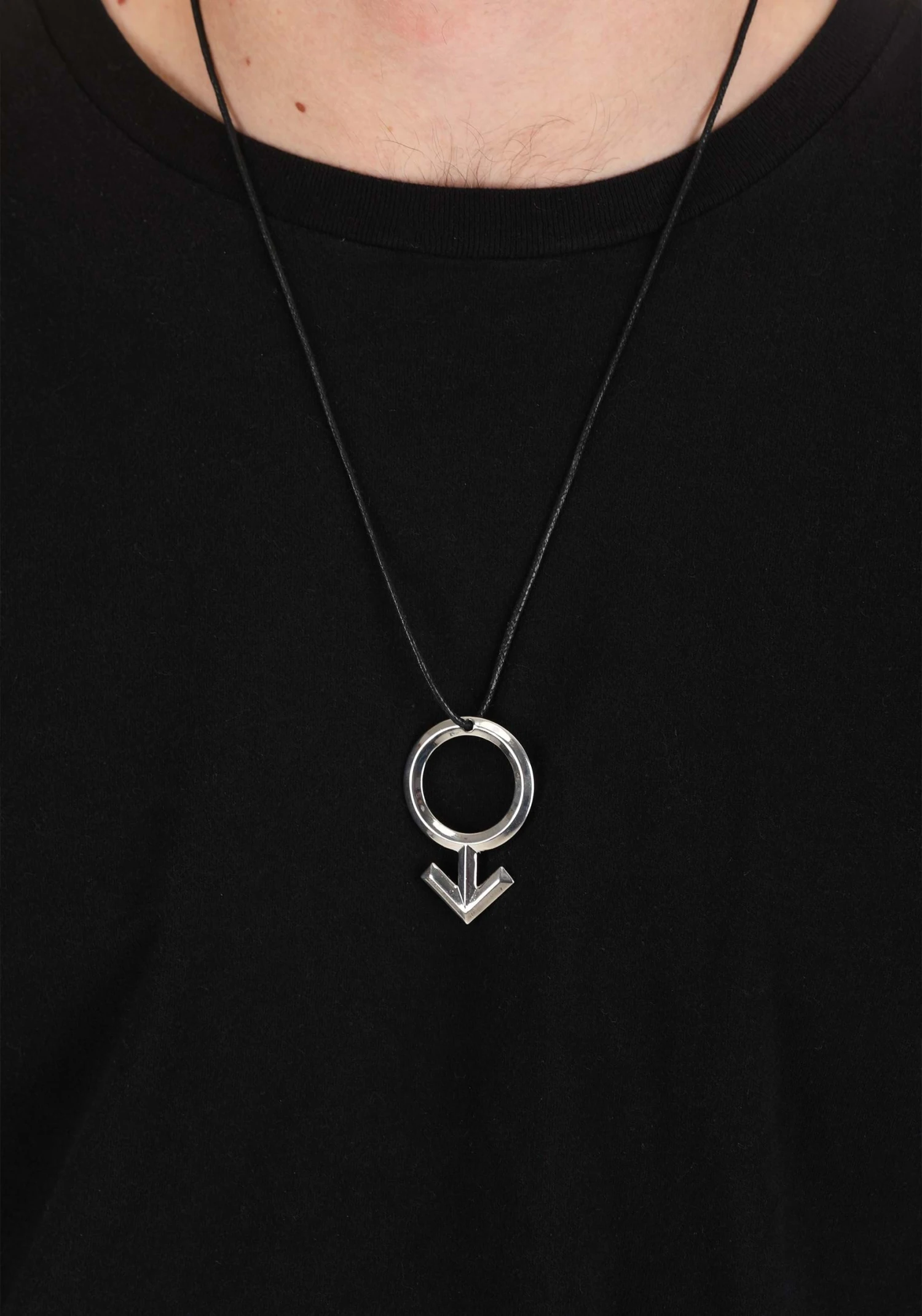 This product comes from our Made By Us collection. It features a silver-tone metal pendant that has been molded to look like the circle and arrow symbol for the male gender. A hole in the circular portion of the pendant allows the black cord to loop through. The cord is long enough to let the pendant swing freely at about chest length.