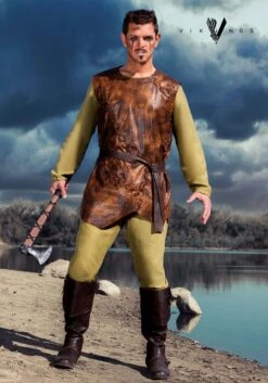 Our creative team is pleased to present this licensed Vikings Floki costume. You’ll look ready for battle and designing new seafaring technology in this rough and tumble look. This Made by Us look features a faux leather tunic with oversized stitching on the front and a faux leather belt around the waist. The soft green undershirt and pants will keep you warm as you sail through the fjords and on to unknown lands. Just to be sure to add Floki’s dramatic eye makeup to make your character instantly recognizable. Now, whether you use charcoal or eyeliner is up to you!