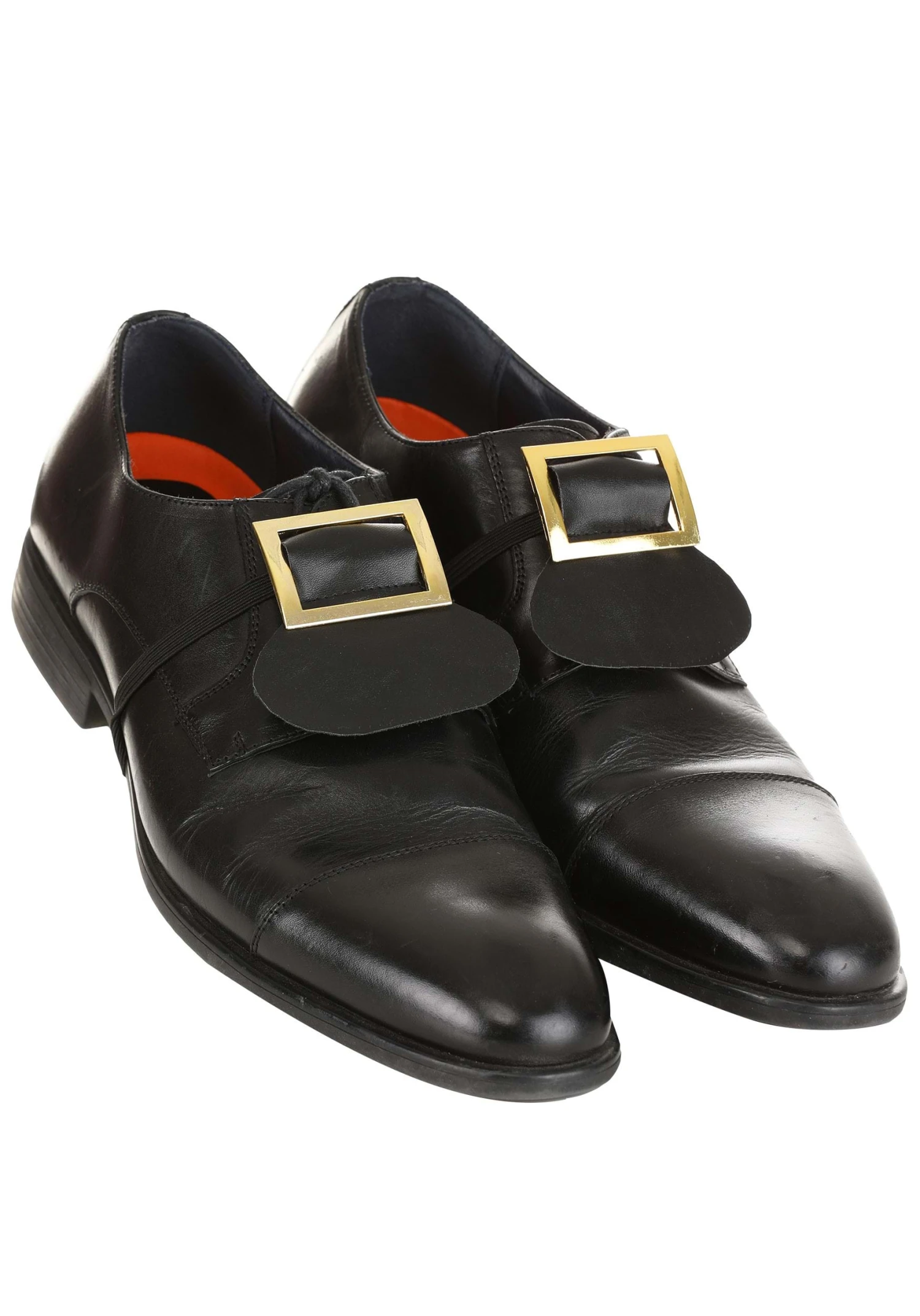 - Each has a black faux leather tongue flap that holds the brass-tone metal buckle