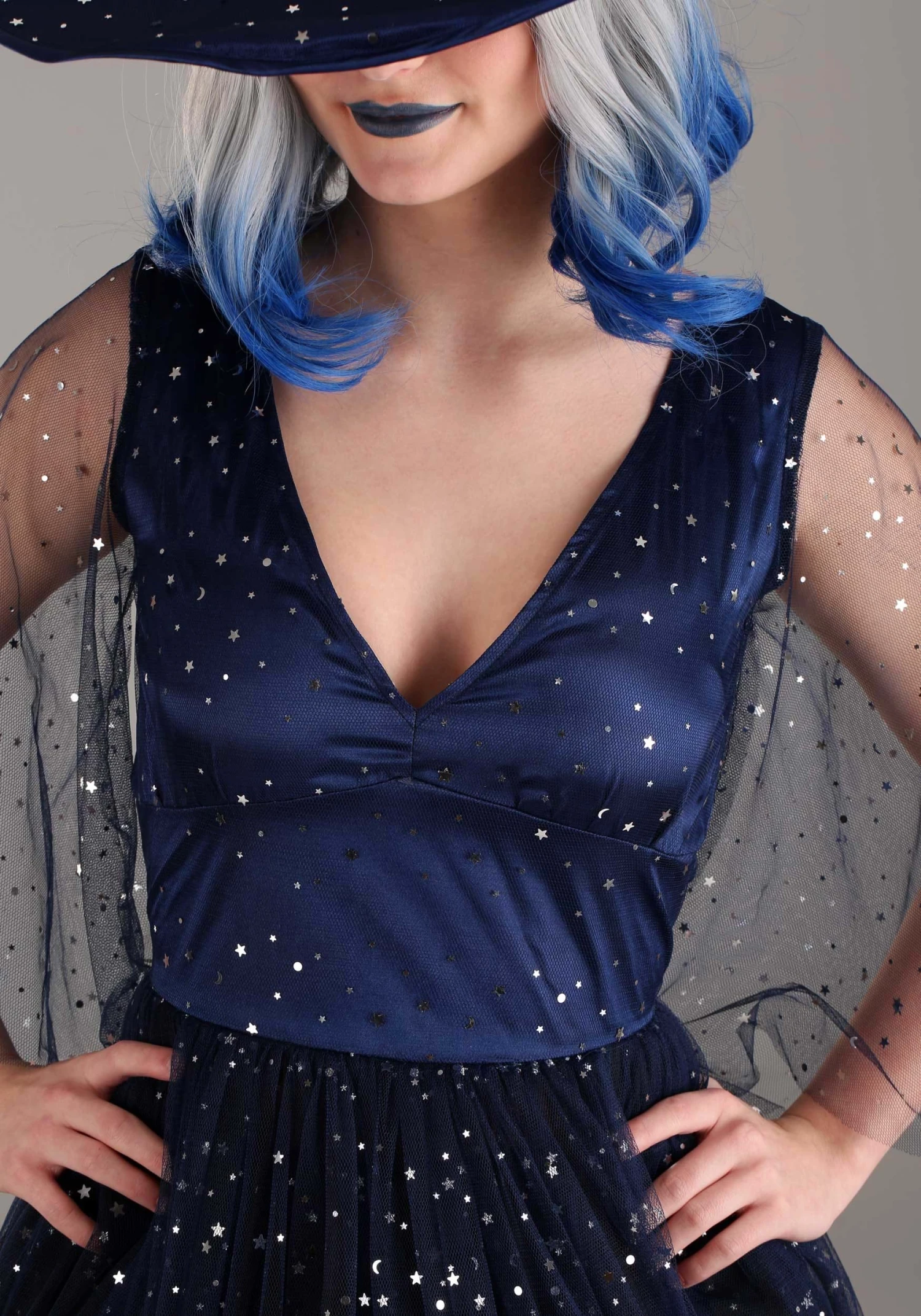 - Bodice has overlay of tulle spangled with small metallic silver stars and moons