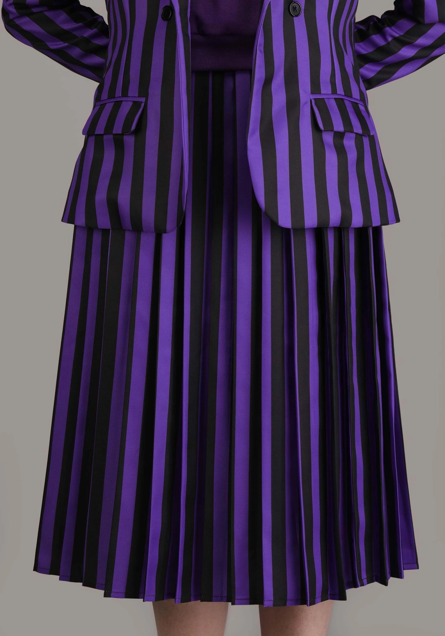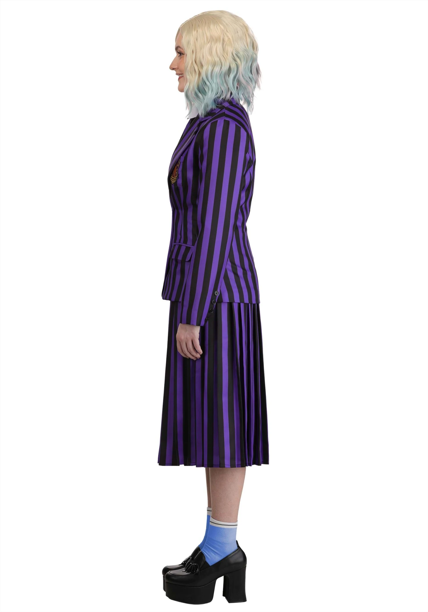 The pleated skirt matches the blazer with identical stripes, hitting mid-calf for a look that’s classic but still cool enough for social media selfies or thwarting ancient prophecies. Underneath, you’ll layer a white polyester broadcloth shirt and a cozy knit vest in Enid’s signature violet hue. A black tie ties it all together—because nothing says “don’t mess with me” like a well-coordinated outfit.