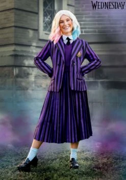 This five-piece costume channels Enid’s cheerful-but-capable aesthetic from the Wednesday series. It starts with the striking purple-and-black striped blazer, made from a sturdy woven poly-cotton material that screams “student body sass.” An embroidered crest on the chest marks you as a proud Nevermore Academy student—no full moon transformation required.