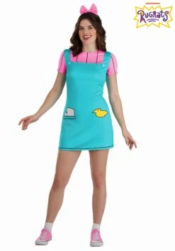 The costume features a one-piece dress with a built-in tee and jumper design. The pink top has Lil’s signature black pinstripes, while the turquoise overlay includes printed details like a cartoon duck and a faux pocket for that unmistakable animated flair. The stretchy knit fabric allows for easy movement, whether you’re marching through a Halloween bash or defending your snack choices with conviction.