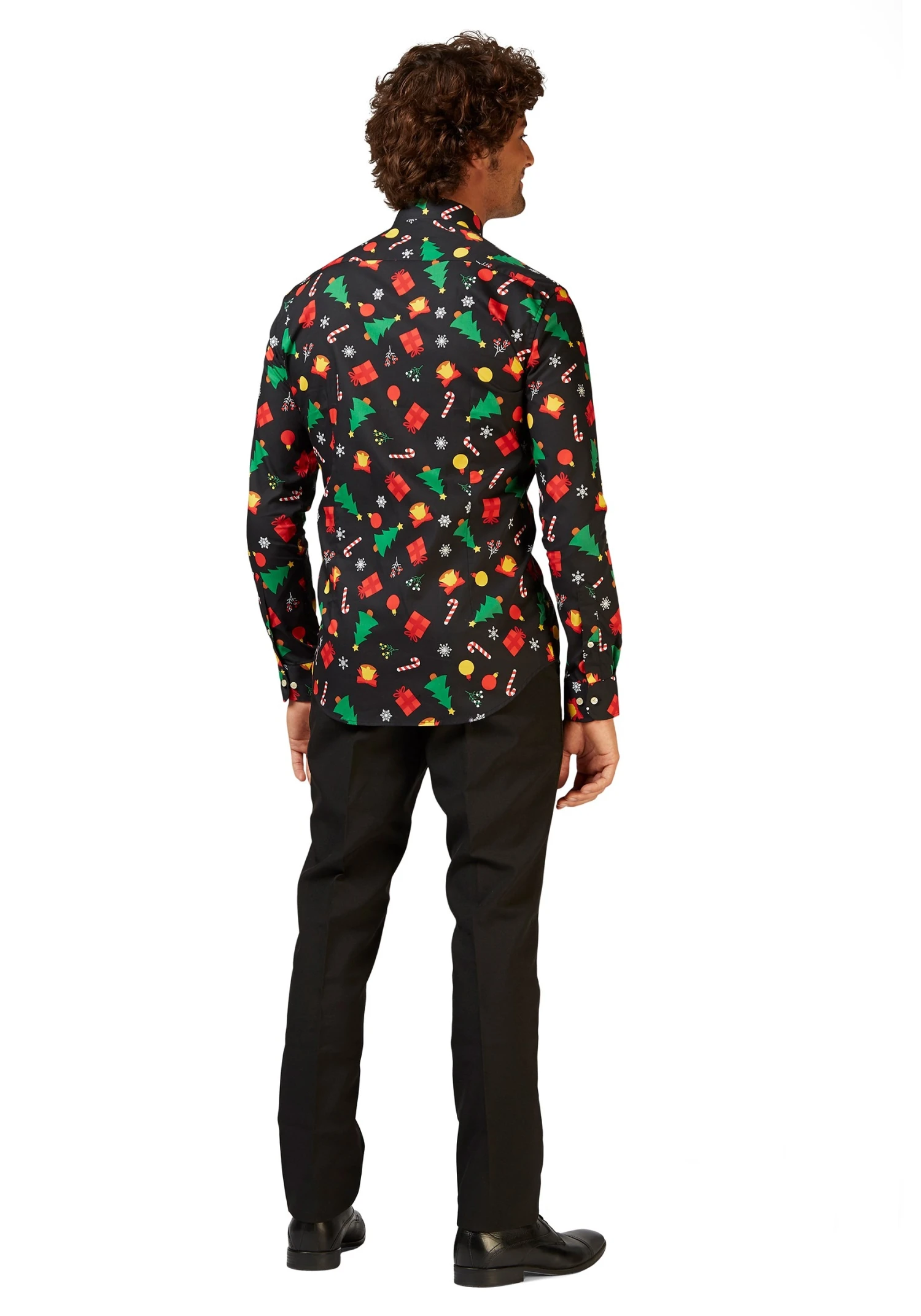 This lovely shirt brings you the holiday spirit in a simple value-up style shirt! The black shirt features an all-over pattern that comes with various pieces of holiday imagery on it. It has presents, holly, snowflakes, candy canes, and more! It even has a few bells and Christmas trees printed on it. You can wear it as a lighter option for your next ugly Christmas sweater party or as a comfy Christmas option in warmer climates! Either way, it’ll add a little Christmas spirit to your December wardrobe!