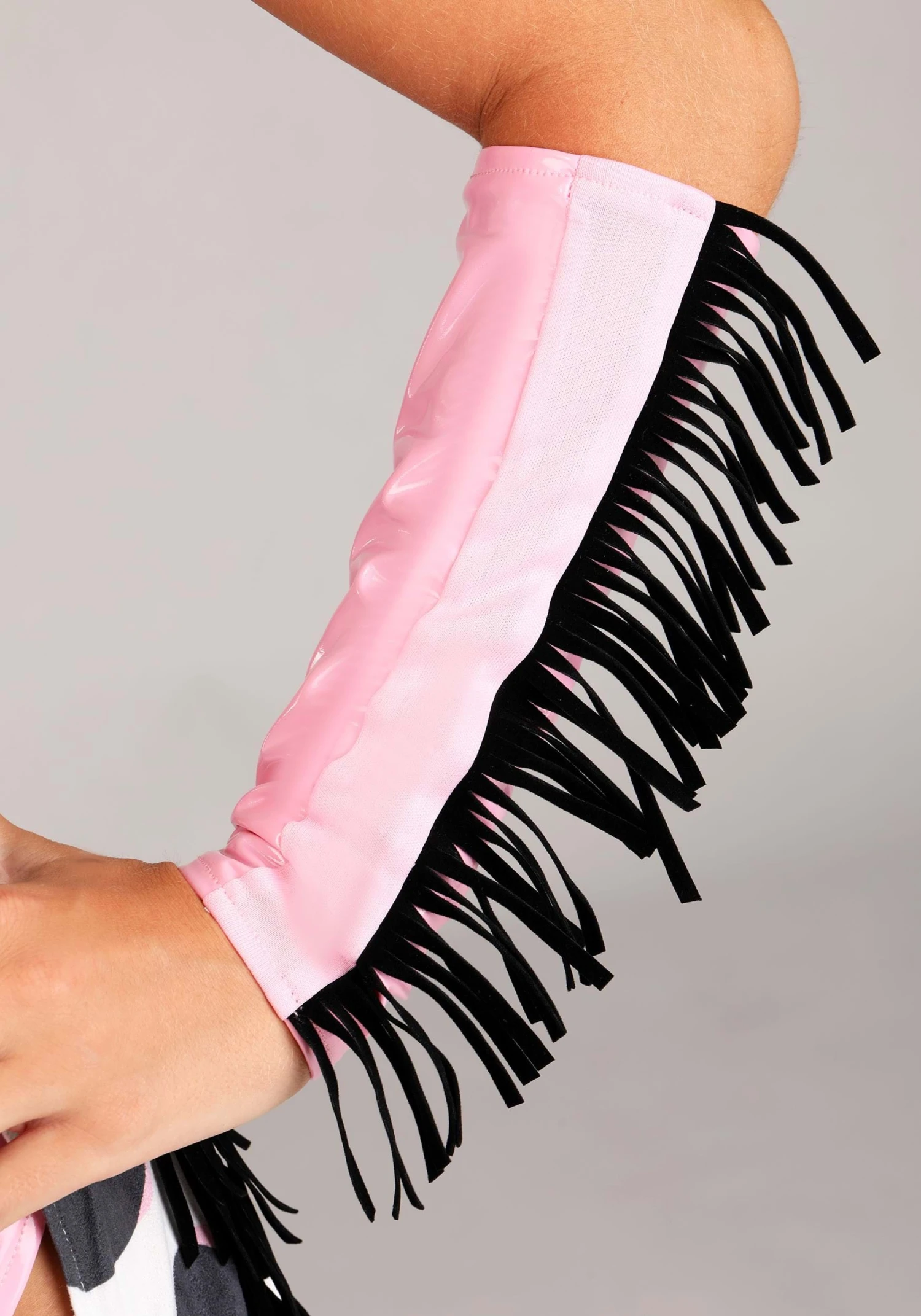 The faux suede chaps steal the show with a bold black-and-white cow print, black fringe along the sides, and an attached faux leather belt with an adjustable buckle—because cowgirls come in all sizes and attitudes. The pink vinyl collar adds a sharp finishing touch with a star brooch and dangling black pearl chains that practically demand a dramatic “howdy.”