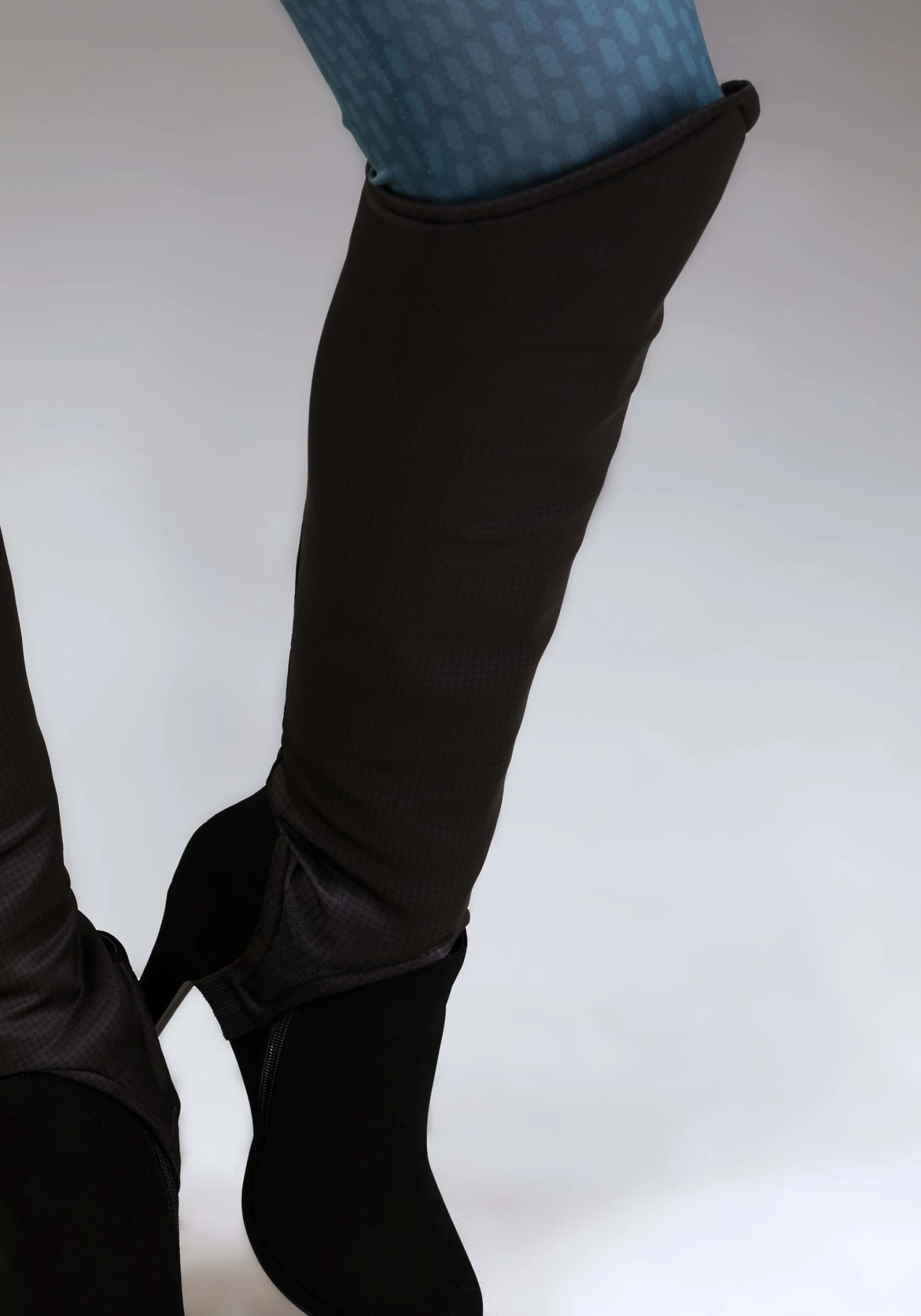- Foam backed boot covers have jersey knit panels, elastic bands to secure under feet