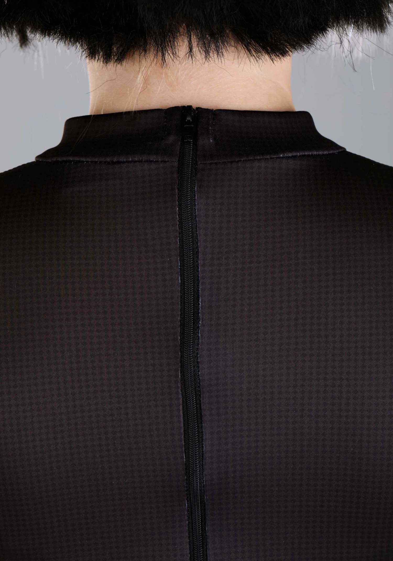 - Shiny jersey knit jumpsuit with foam backed black fabric, zipper down center back