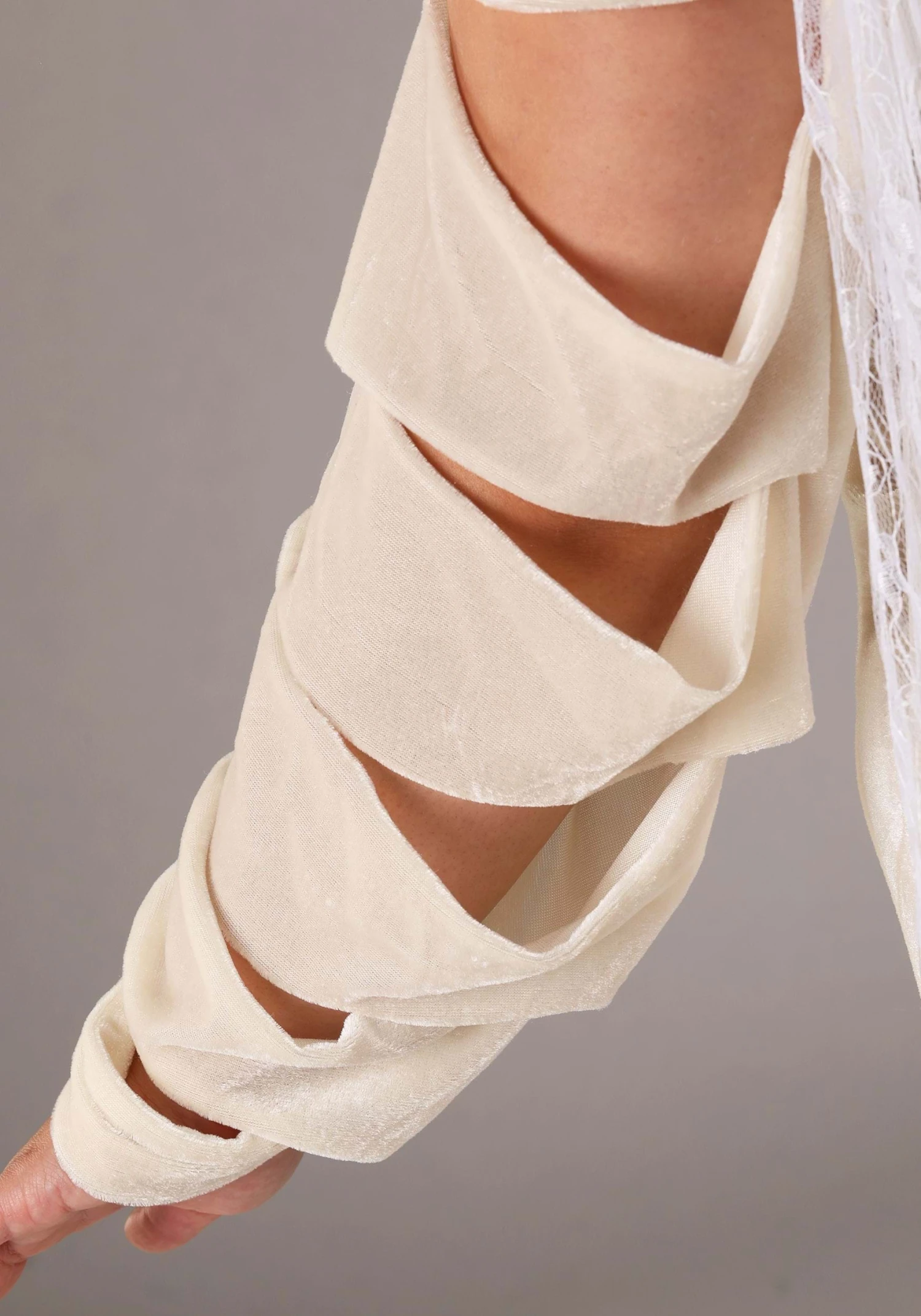 - Ivory velvet dress has open shoulders, ruched bodice