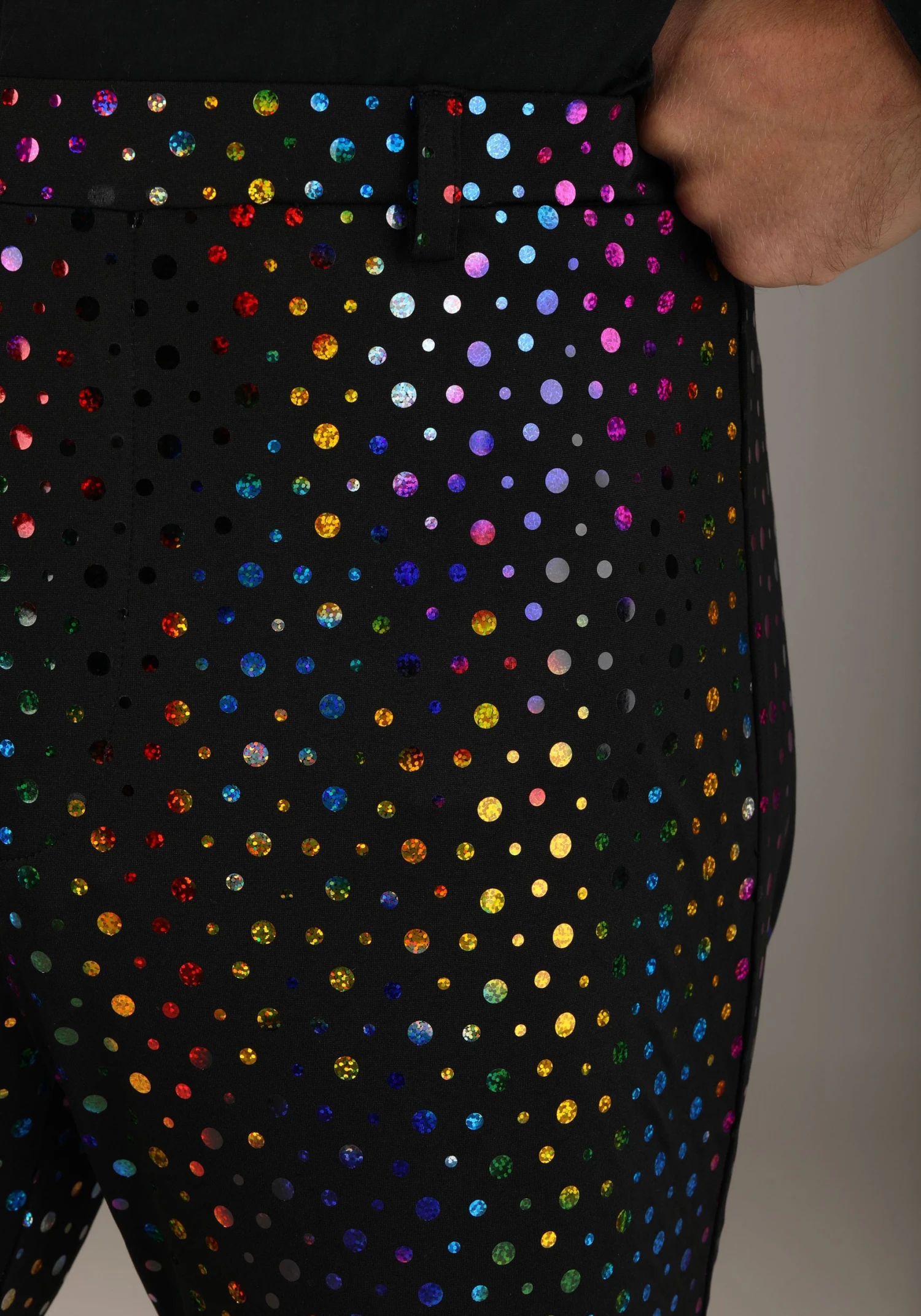 Now, let’s dive into the sparkling details. Made from a blend of 97% polyester and 3% spandex sequin knit fabric, these pants are the epitome of disco glamour. The black fabric is a cosmic canvas sprinkled with multicolored sequins that catch the light with every move, ensuring you’re the star of the show.