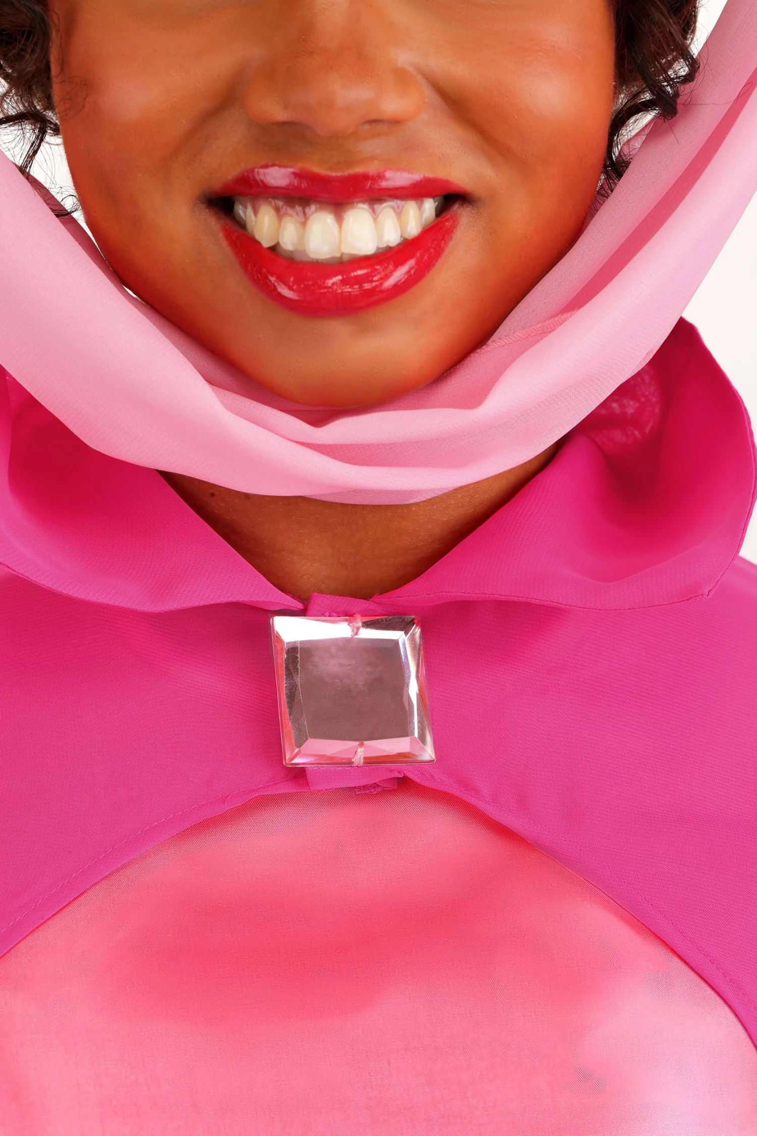 - Chiffon cape has an acrylic jewel, underneath it secures the cape with hook and loop fastener, slits in the back of the cape to slide the wings through