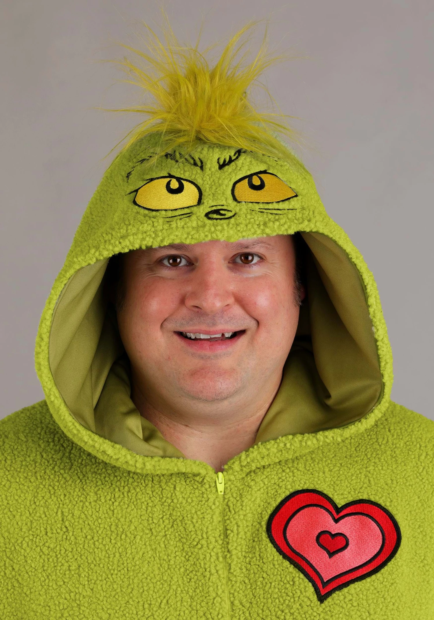 The hood features embroidered Grinch facial features and a tuft of fuzzy yellow hair on top for that full-on mean-mug moment. Inside the hood, a poly knit lining keeps things smooth. Over the heart? A bright red embroidered symbol that may or may not grow three sizes when dessert is served.