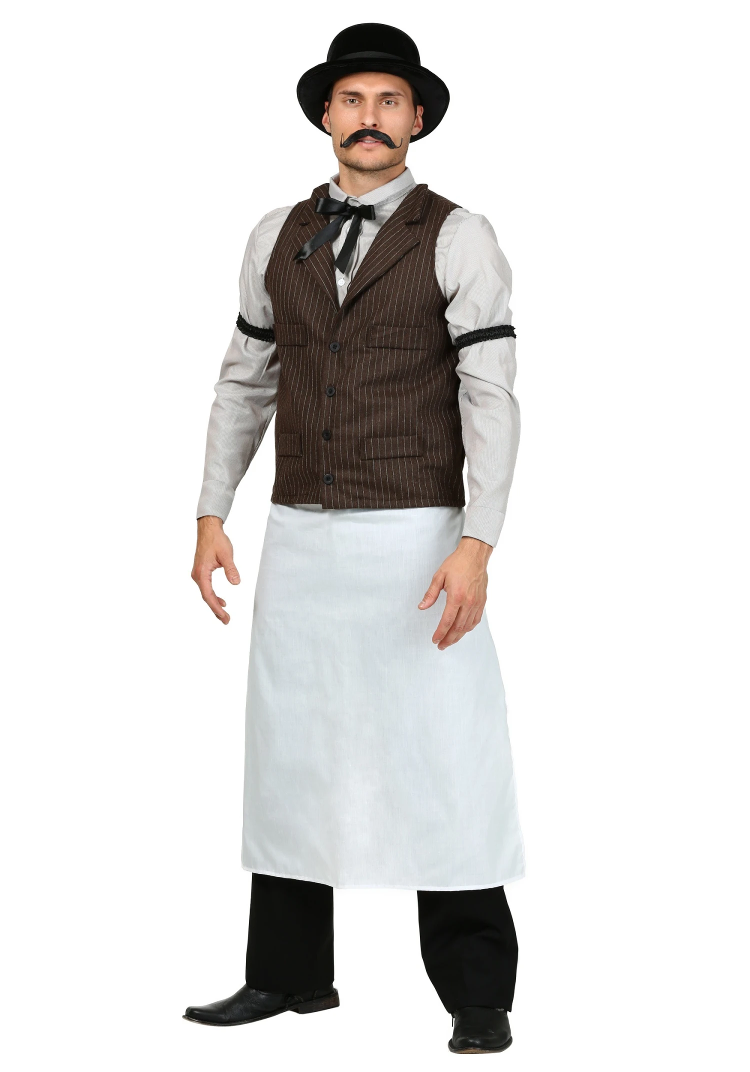 Based on a classic look you’d find in a saloon in Tombstone, Arizona, this Old West Bartender Costume will have you looking tough enough to serve any kind of rough customer. It’s the plus sized version of our classic bartender costume, so larger-sized cowboys can fit into it no problem. The shirt and vest combo have a classy, yet stern look about them. And these pieces are made of oxford cloth and worsted. That’s some sturdy fabric there, pardner. That’ll stand up to a bar-room scuffle without tearing apart, so you can toss any rowdy troublemaker out of your saloon without worrying about your shirt ripping. That’s something any cowpoke can appreciate.