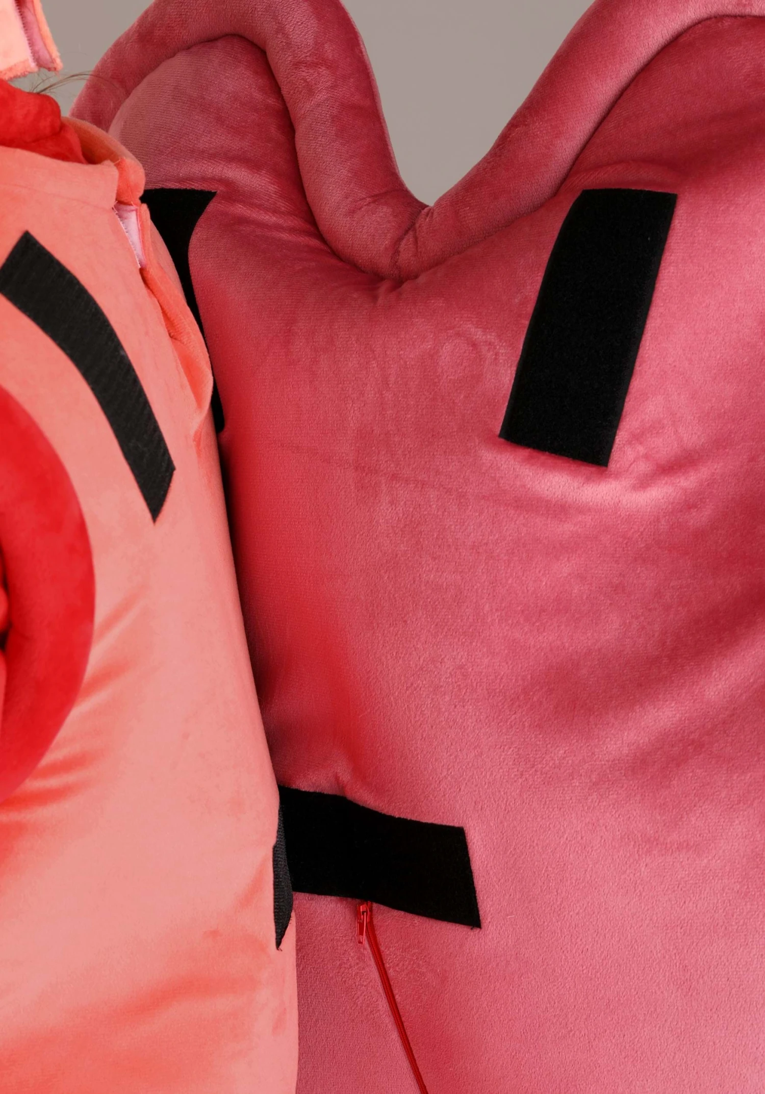 - Foam backed minky shell secures to the back of the bodysuit with hook and loop fasteners
