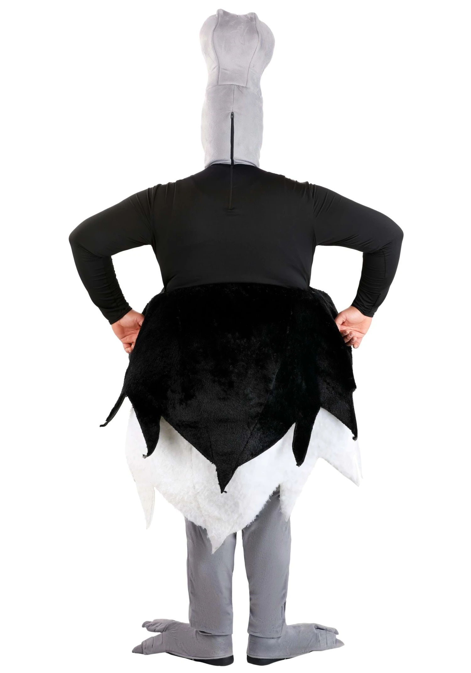 The pants pull on easily with an elastic waistband and come with attached stuffed feet shaped like ostrich toes, so you’re bird-ready from head to talon. Over it all goes the main bodypiece—a fluffy, rounded black “torso” with foam padding and built-in tail feathers to complete your transformation into the world’s sassiest land bird. Everything fits comfortably over your own clothes and leaves plenty of room for exaggerated waddle-walking.