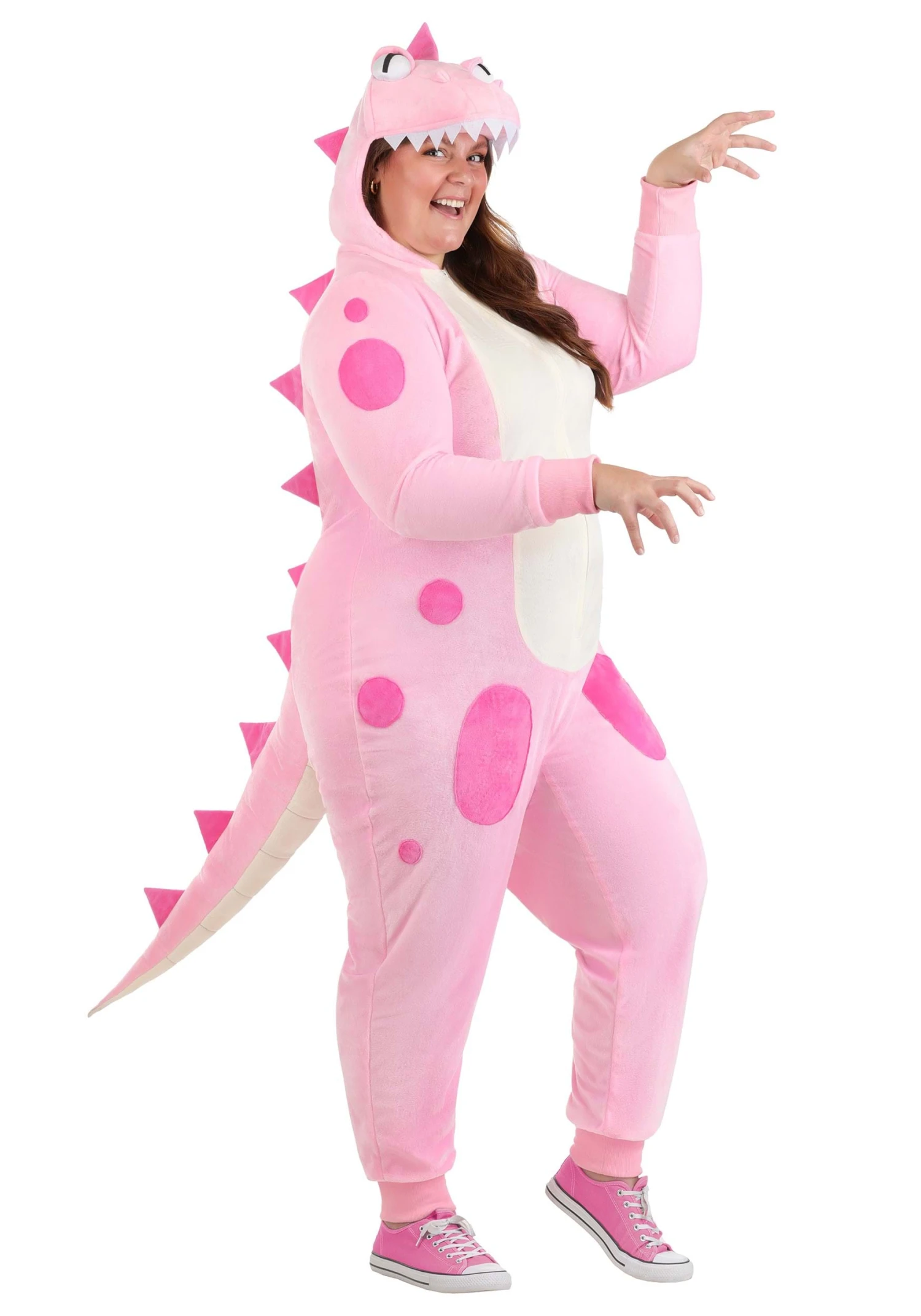 This Plus Size Women’s Pink Dinosaur Onesie Costume is here to prove that dinos didn’t go extinct—they just got cuddlier and way more stylish. Ferocious? Maybe. Fabulous? Absolutely. Slip into this delightfully prehistoric look and prepare to stomp, lounge, or snack your way through the day like the plush apex predator you were always meant to be. Because sometimes evolution looks like cozy fleece and a really good tail.