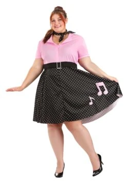 Because you can still hear a lot of those iconic songs on the radio today. They never quite went out of style! That’s why we offer this Plus Size Sock Hop Cutie Costume, one of several exclusive outfits designed to aid time travellers in their decade-hopping excursions. Whether you’ve truly arrived in the 1950s or just one more era nostalgic for the simple pleasures of the poodle skirt and the soda fountain, this great outfit should elicit a warm welcome from anyone you might bump into. The pink blouse and polka dots of the skirt and scarf are practically universal signs of good will and cheer, and the music note appliques say put another dime in the jukebox!