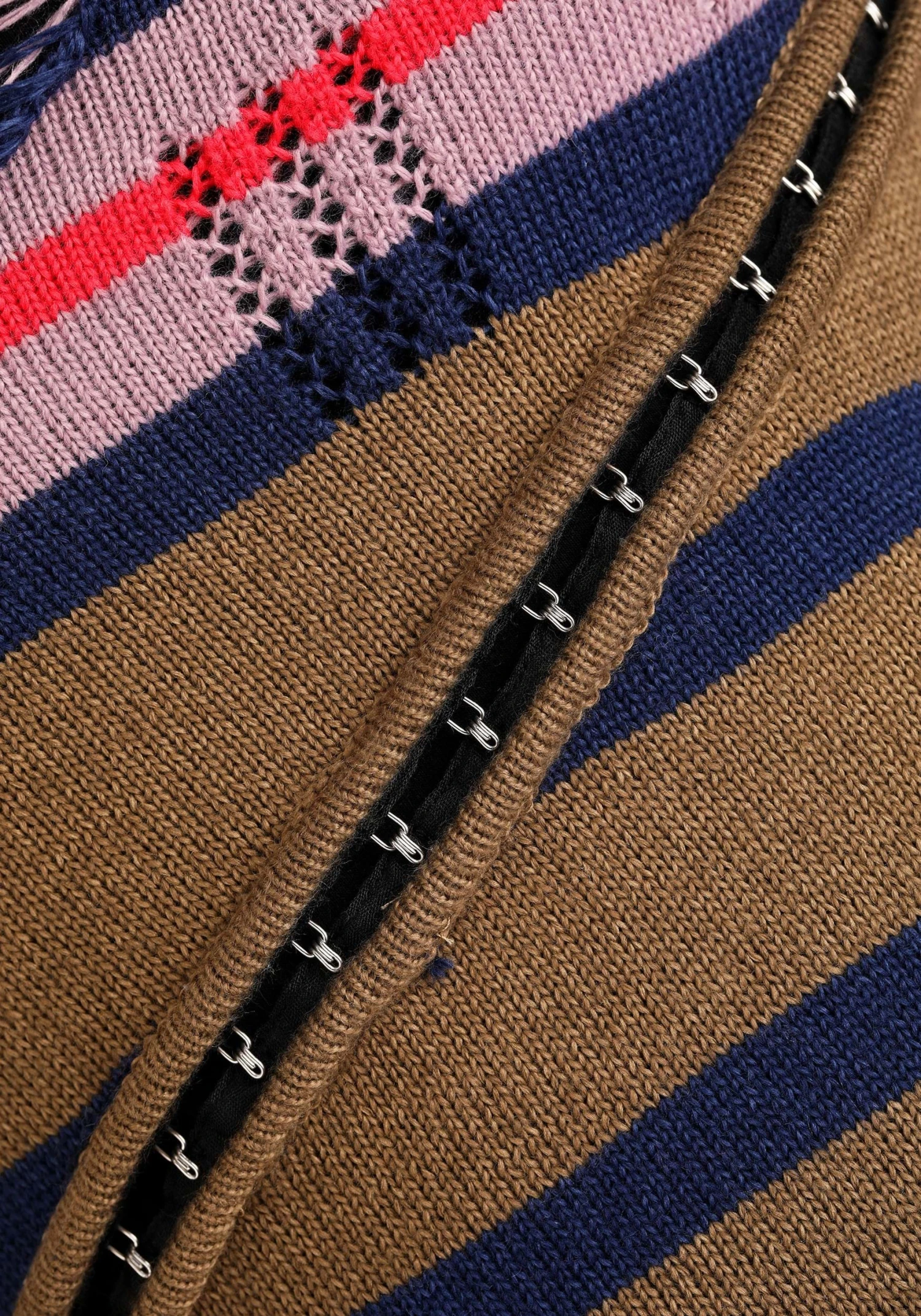 - Hook and eye closures running diagonal in the middle of the dress