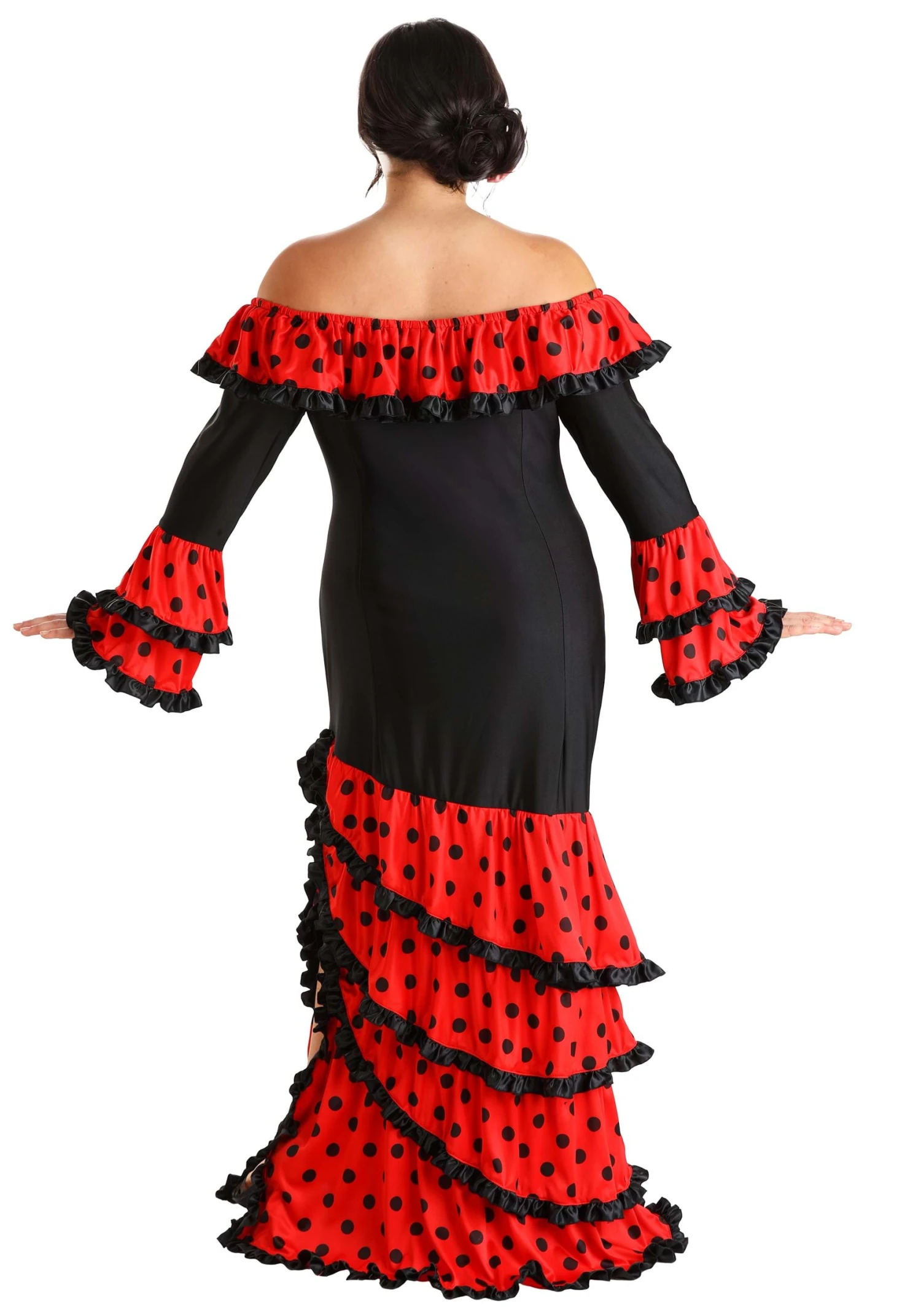 - Flared sleeves end in tiered ruffles