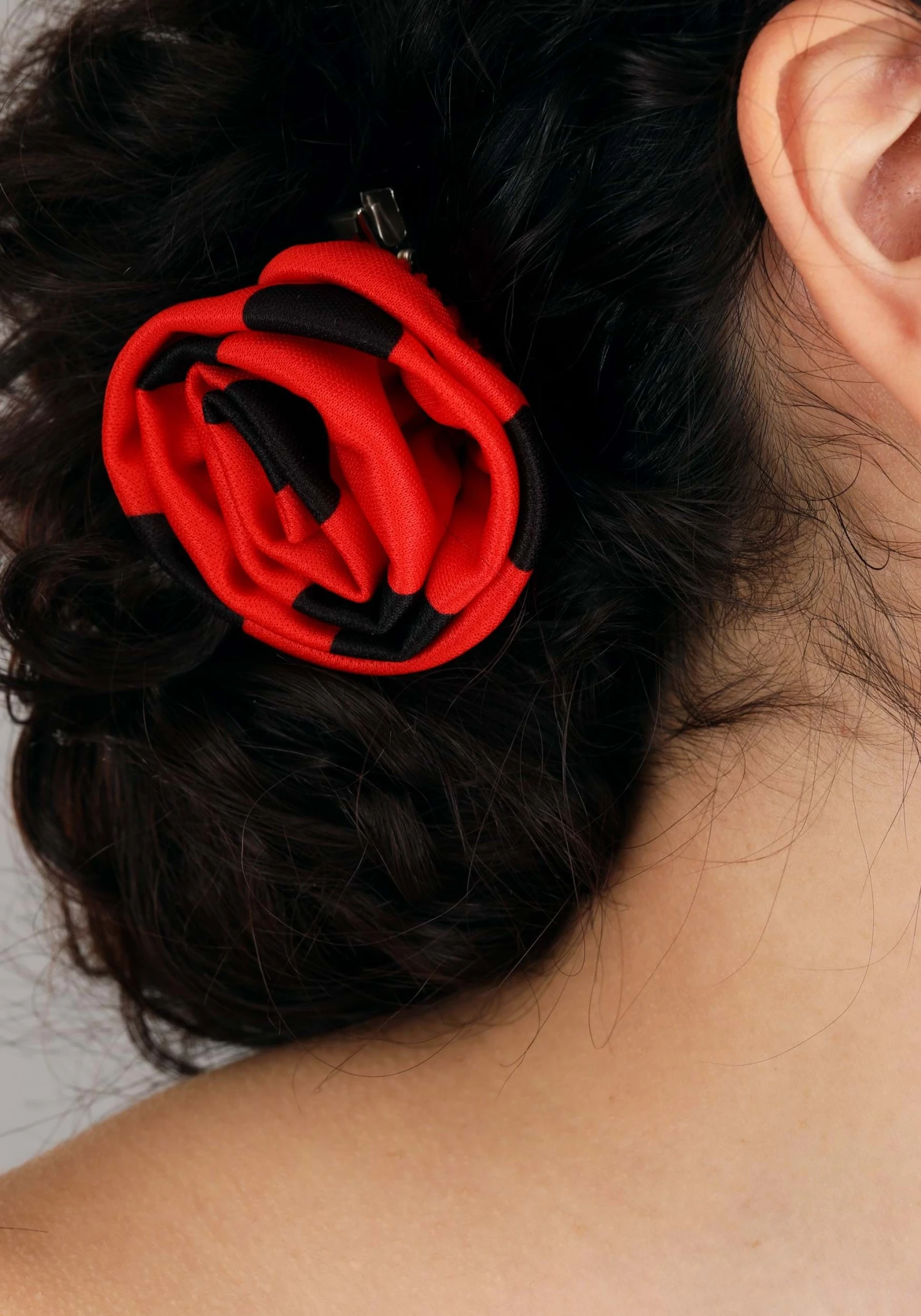 - Fabric rosette attached to metal alligator clip