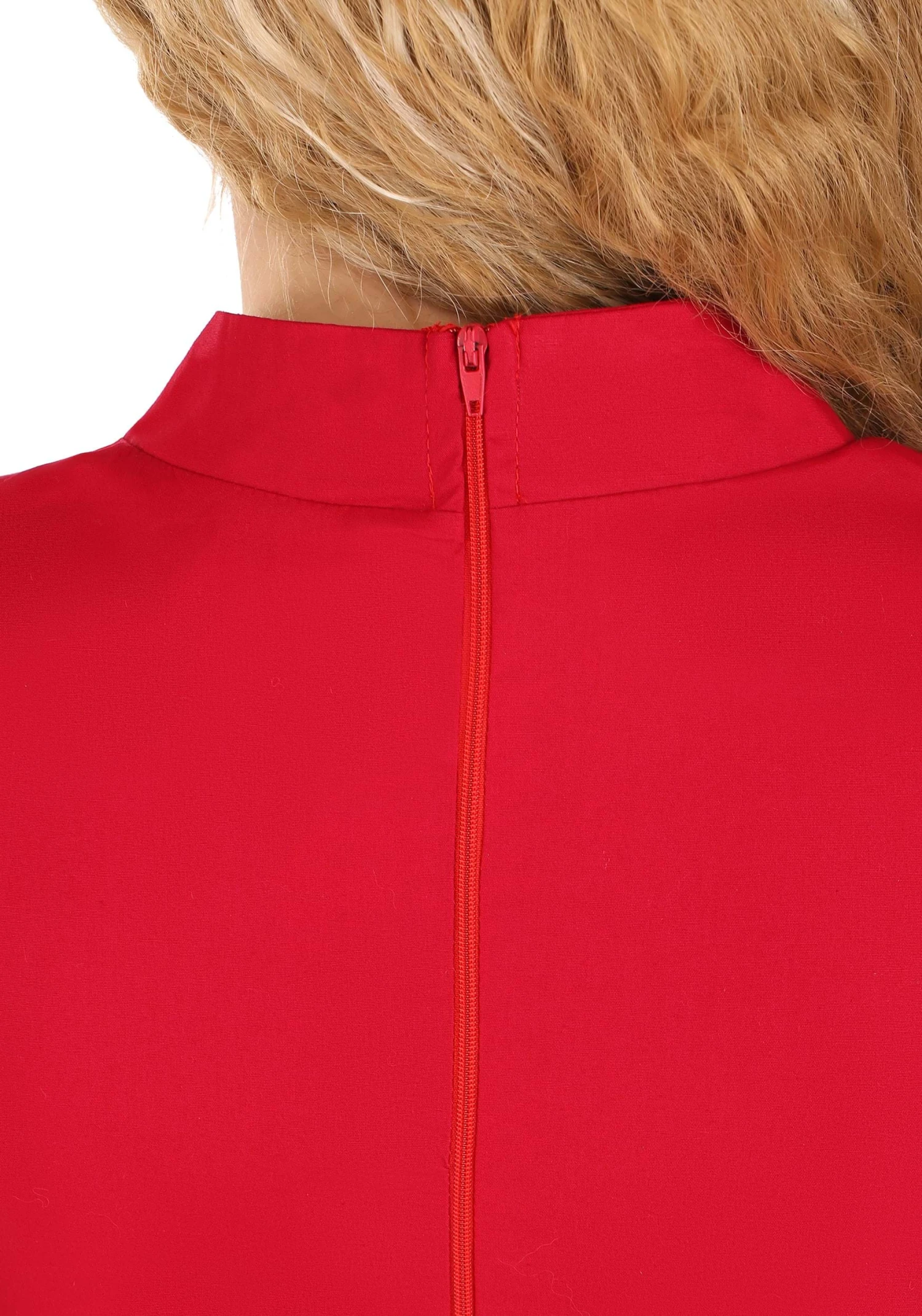 - Dress has back zipper, hook and loop fastener at sleeve cuffs