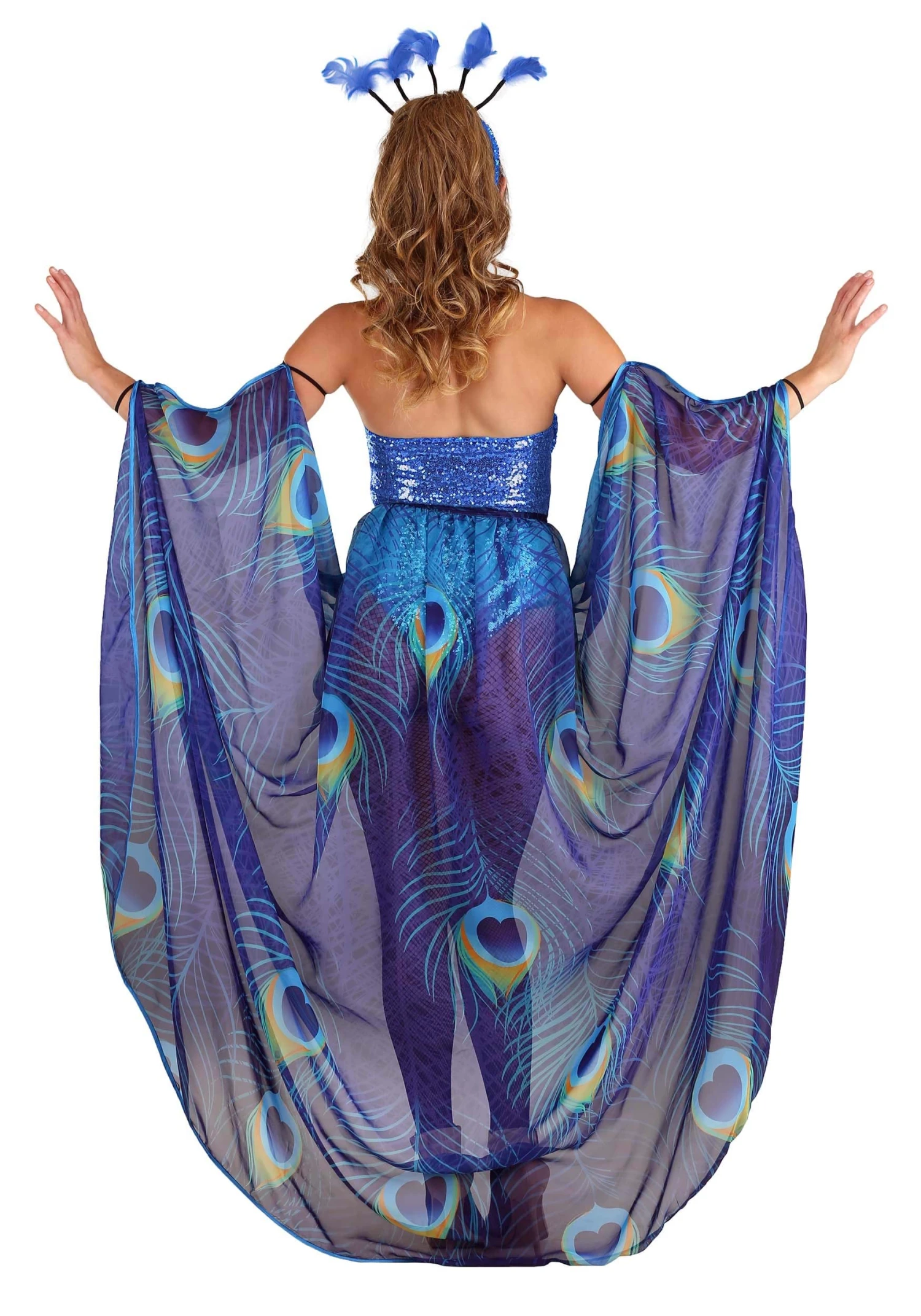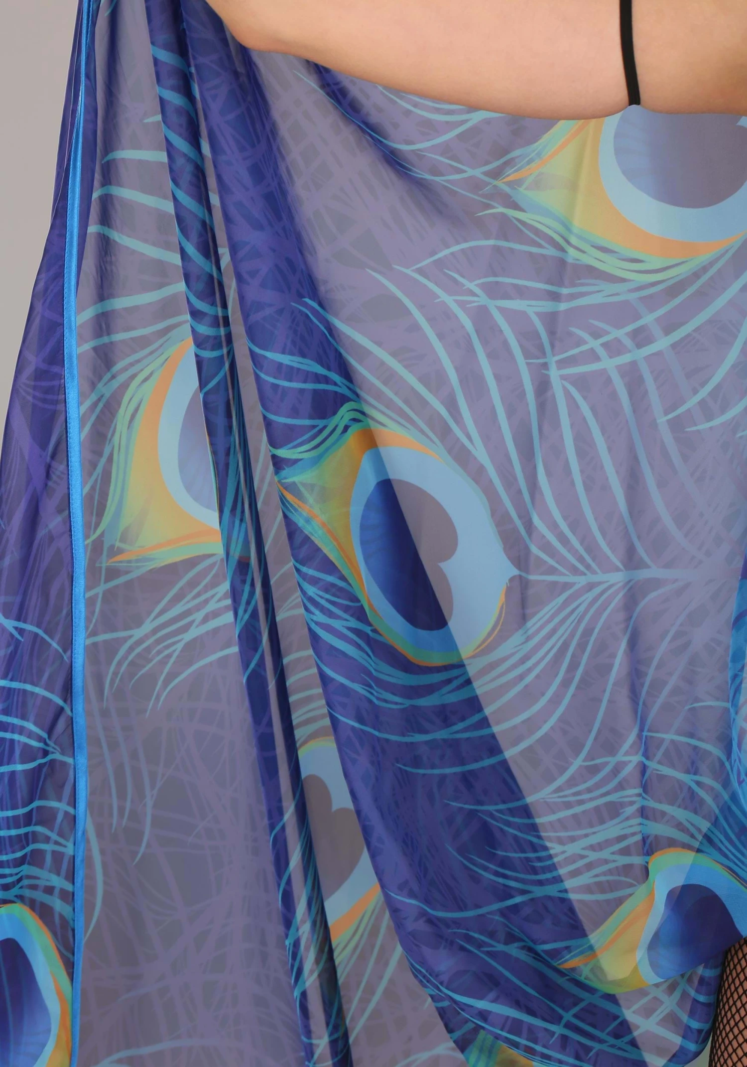 - Chiffon skirt has a peacock pattern with satin blue ties