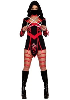 This is an exclusive Women’s Red Dragon Ninja Hooded Romper Costume.