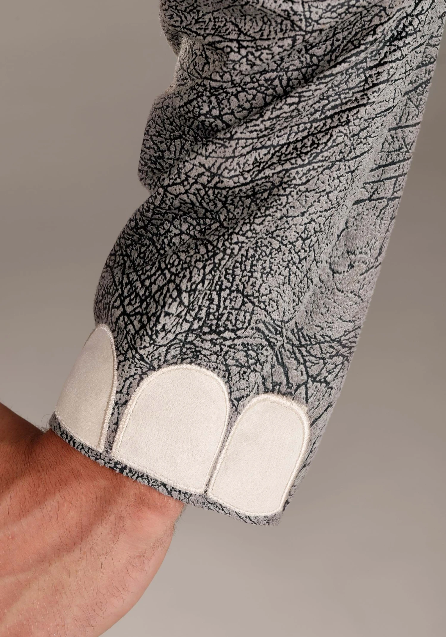 - Rhino hide print faux suede jumpsuit has off-center front hook & loop fastener strip from neckline to left waistline