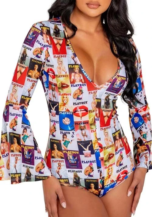 - Step-in bodysuit has deep V-neckline, snaps at crotch
