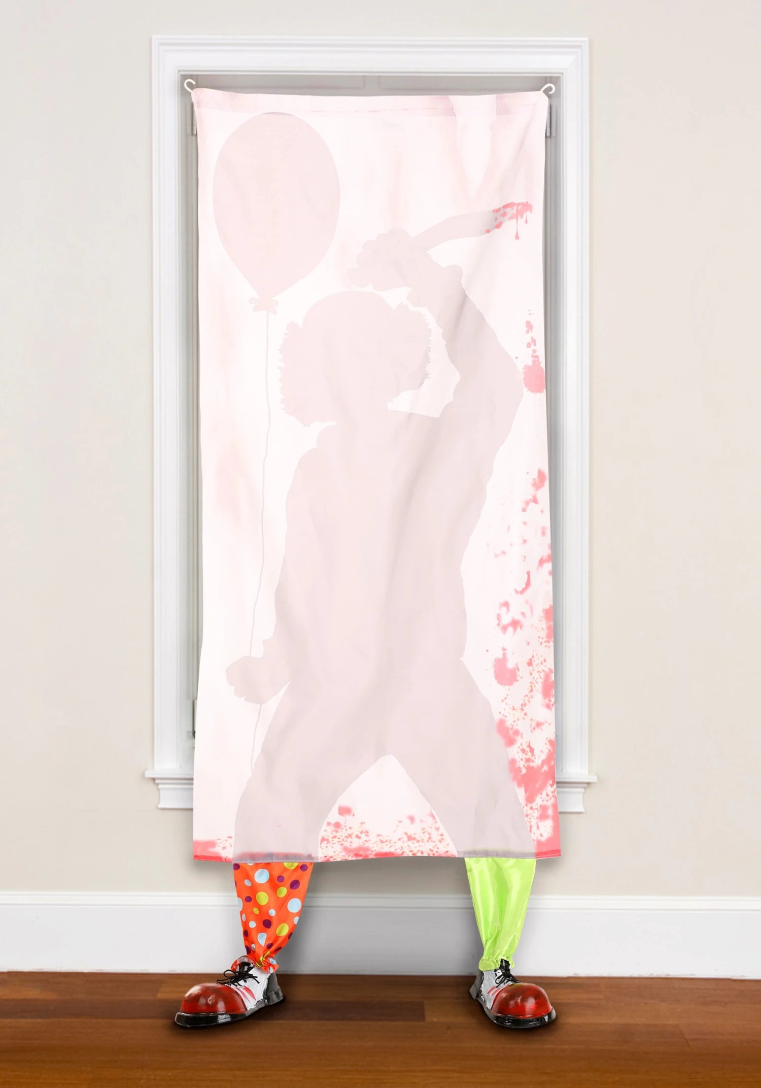 This scary decoration helps turn your home into a horror movie! The curtain is a simple polyester material that comes with faux blood stains. It fits onto most standard curtain rods and measures a full 6 feet long. The bottom of the curtain has a pair of dangling legs with clown shoes attached to them. Add it to any room in your home to instantly add to the creep factor.