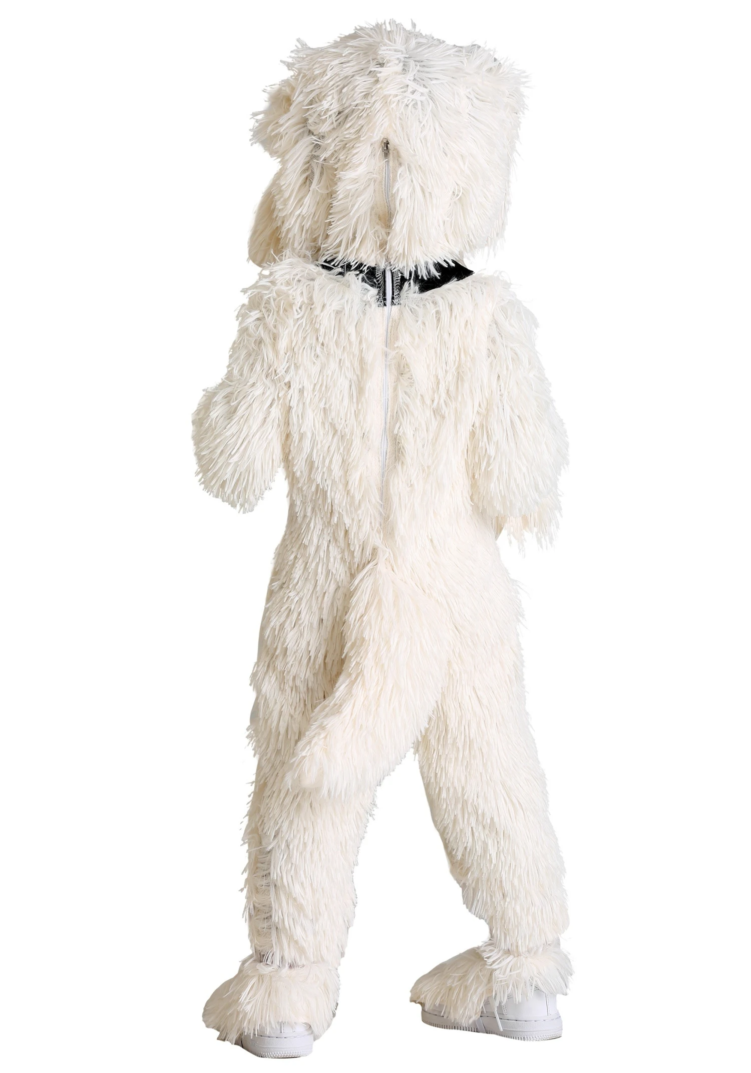 This adorable costume is one of our Made by Us costumes! Our costume designers worked hard to craft a look that’s cozy and cute for your child. It starts with a full-body jumpsuit that’s covered in a layer of white, faux fur. It fits with a zipper in the back and comes with a soft, fuzzy headpiece attached to the top of the suit. The sleeves have attached, paw-shaped, mitts, to give your little one a pair of cute puppy paws! The foot covers fit over most pairs of shoes, so your child can wear their favorite pair of shoes with this outfit.