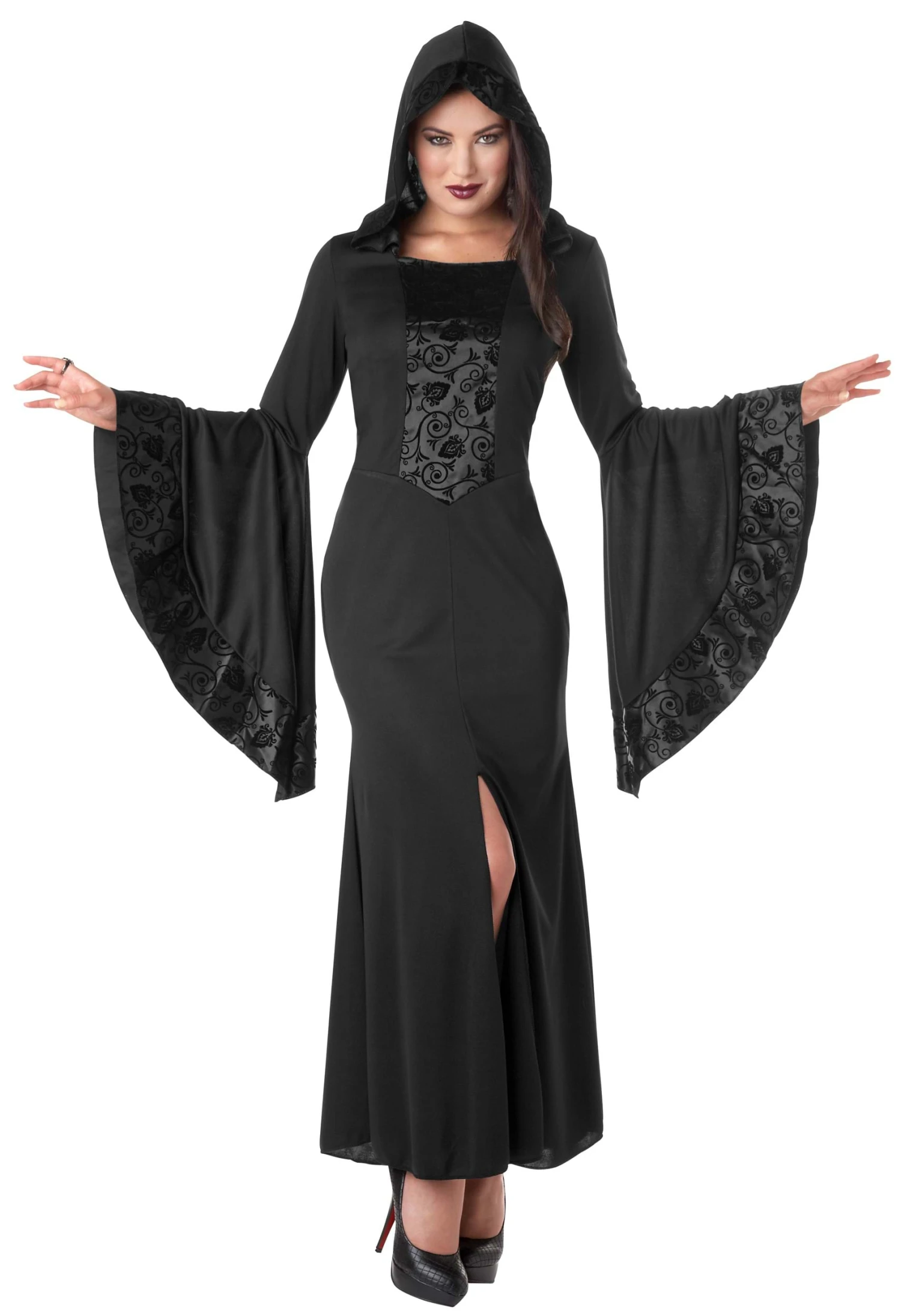 - Robe has bodice inset, sleeve cuffs, and hood edging of flocked satin