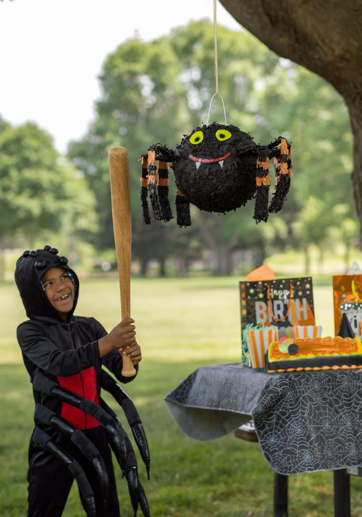 This exclusive Spider Pinata Halloween Decoration makes the perfect dual prop and party game for your next October get-together! The cardboard pinata has an approximately ten-inch spherical body that is completely covered in fringed black tissue. It’s decorated with paper eyes, mouth, and fangs, and features eight folded cardboard legs that can be extended as desired. A tissue-covered hole in the top of the pinata allows you to fill its inner cavity with treats.