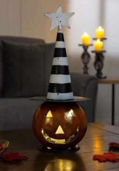 14″ Owl With Witch Hat On Gold Jack ‘O Lantern Halloween Decoration
