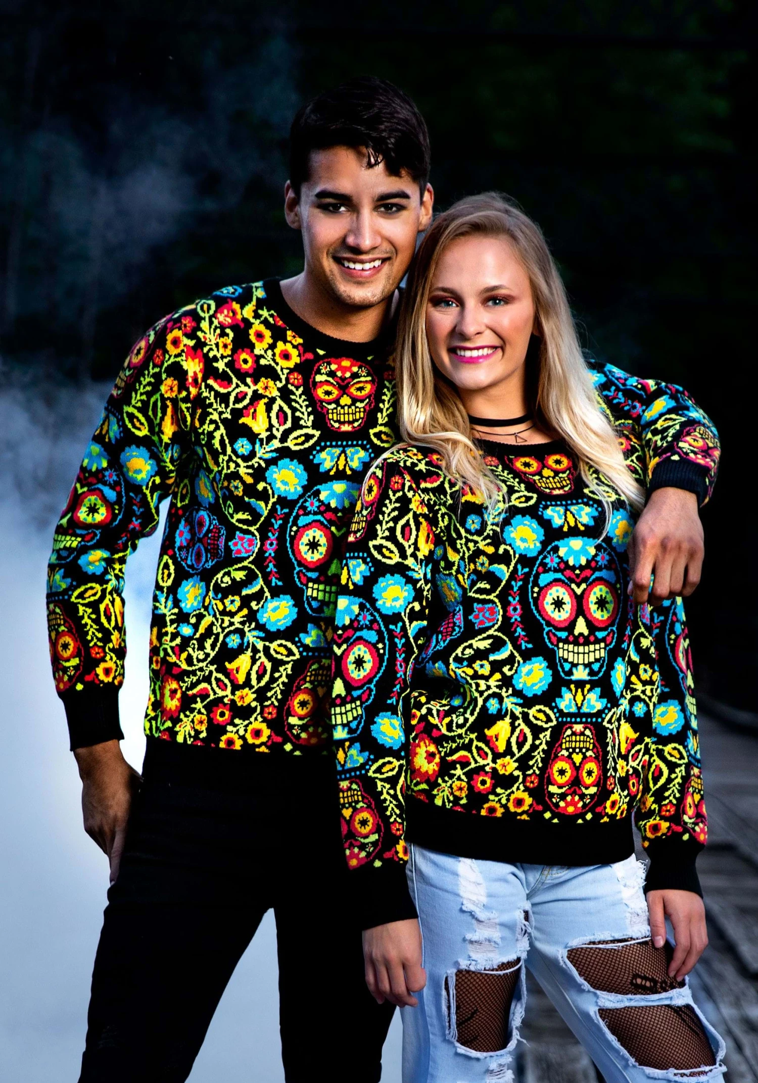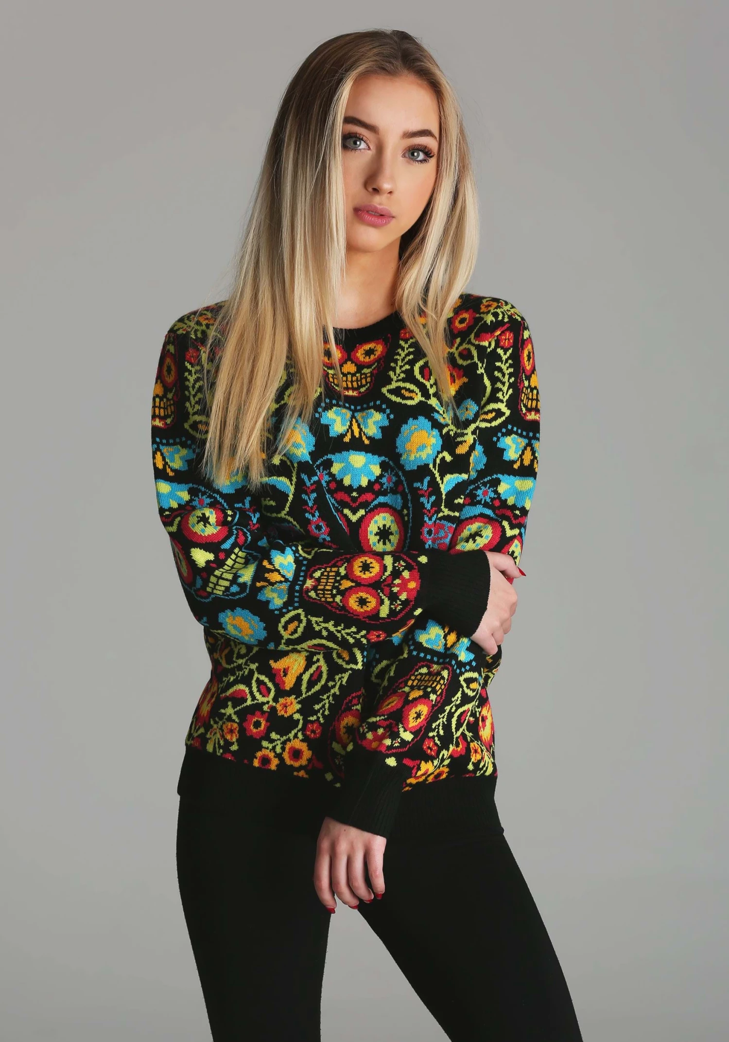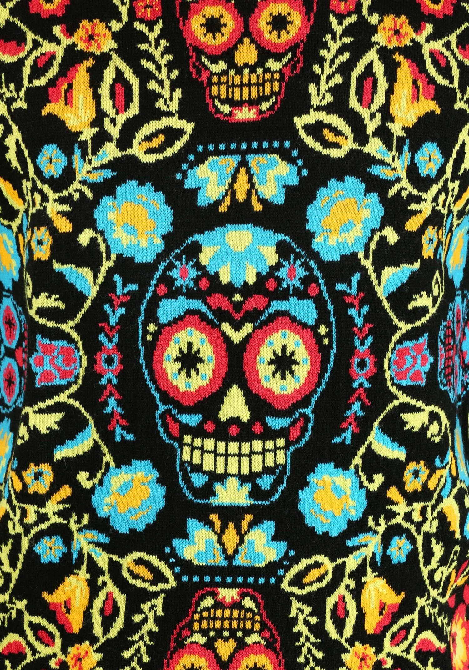 Are you a sweet person? Yeah, we bet you are! But that doesn’t mean you’re boring. You love this, the spookiest of seasons, as much as any might-be-meanie out there. You just don’t limit yourself to the grittier side of Halloween. Why should you adorn yourself in all black when this season is more colorful than most? There too many picturesque activities to do to go around wearing dull colors. Picking pumpkins, baking apple bars, and walking through farmer’s markets… these are the kinds of memories that are made even better when you’re wearing a striking outfit. And that is where this bright Sugar Skull sweater comes into play.
