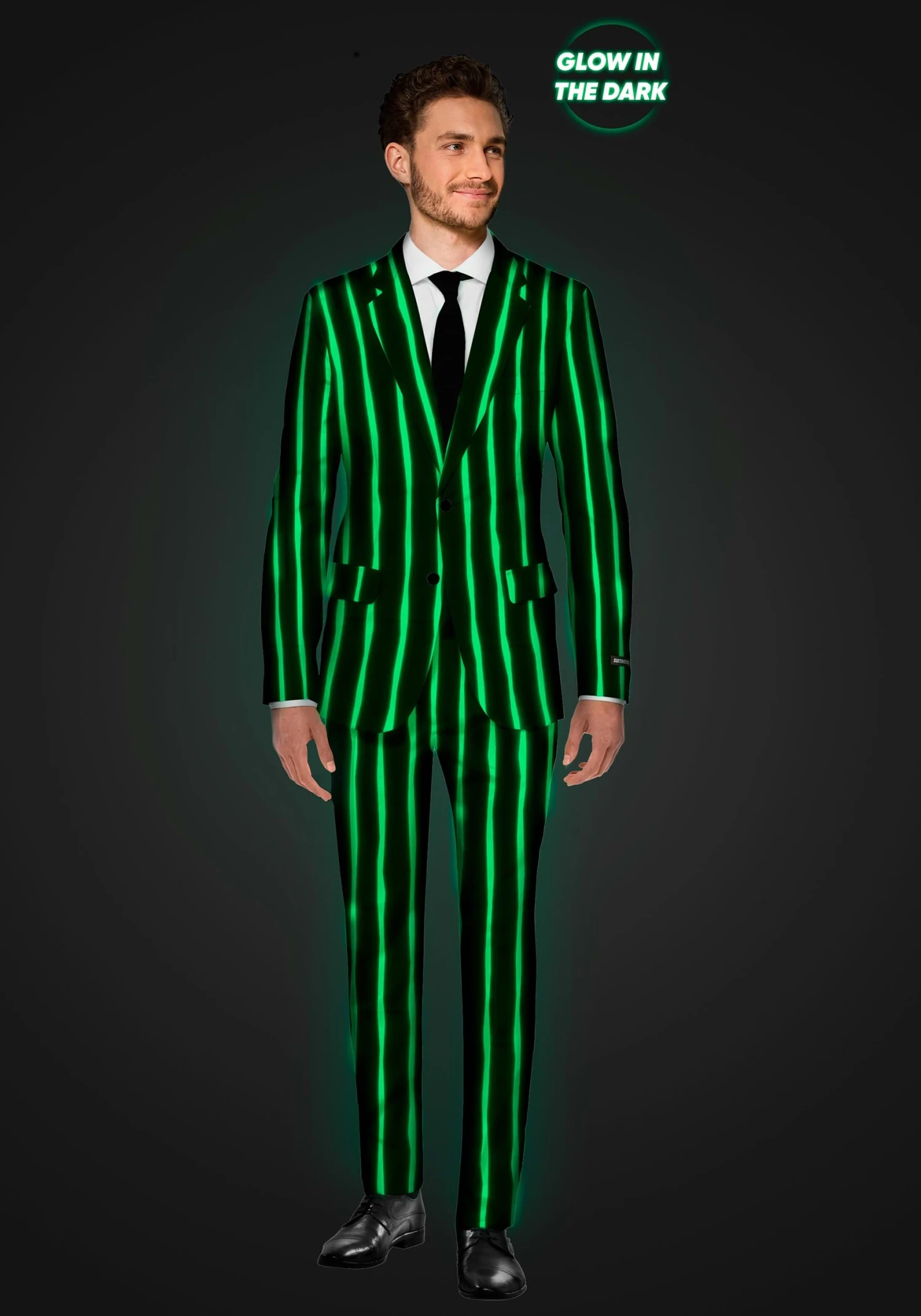 This is a Suitmeister Oversized Glow in the Dark Pinstripe Black Suit.