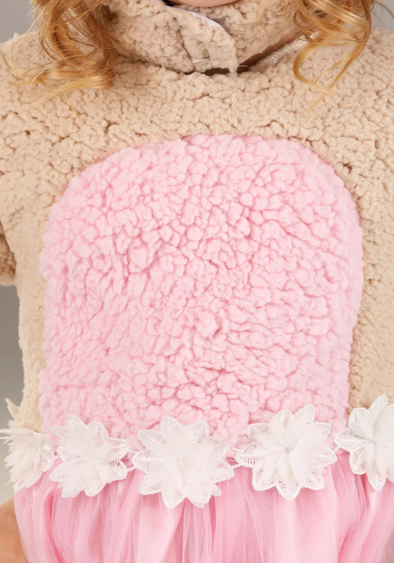 - Sherpa bodice top, pink satin skirt of dress with tulle layer