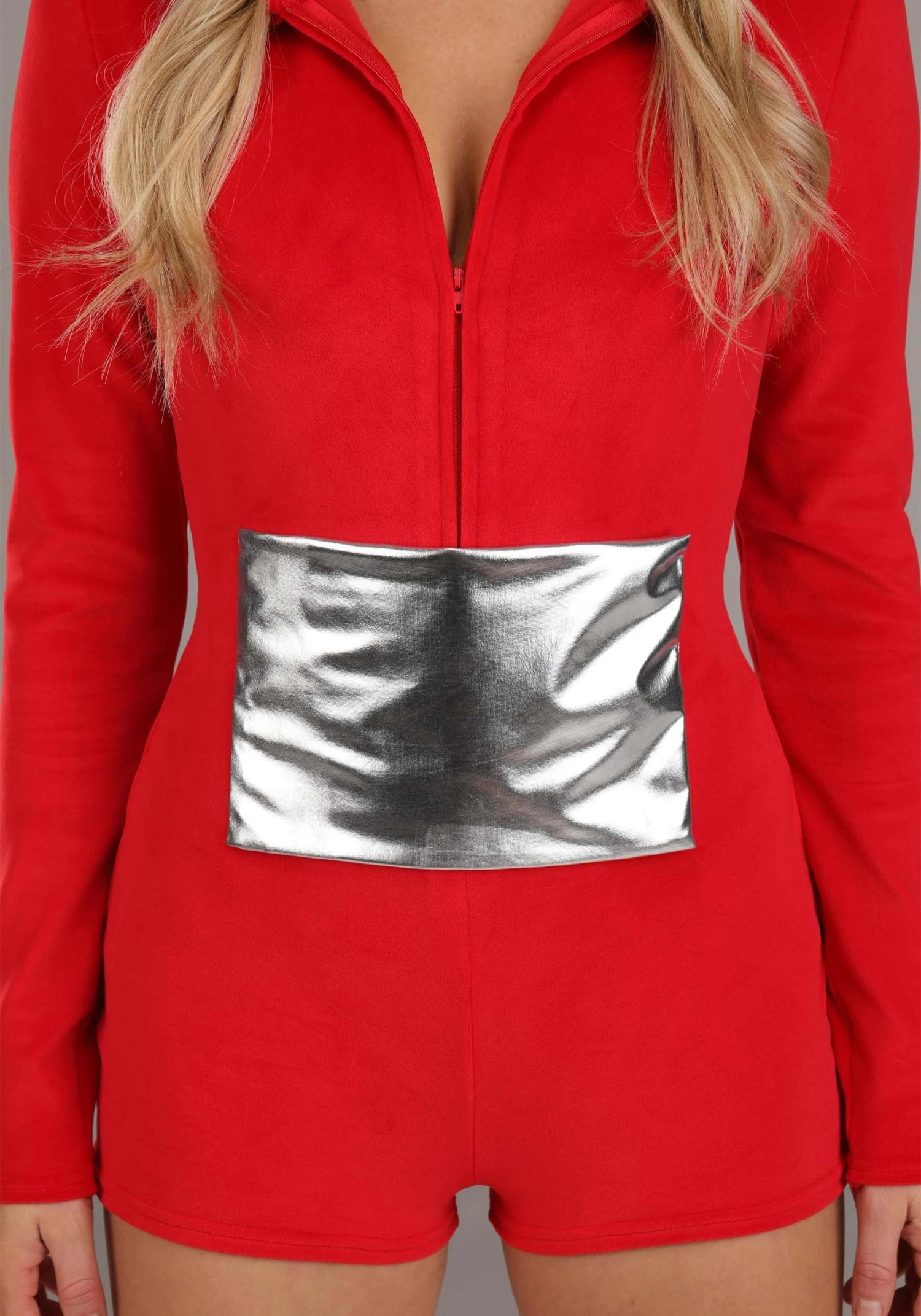 - Stretchy, cuddle plush romper has a zipper down center front, foil metallic belly piece secures over zipper with hook and loop fastener