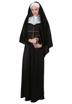 You can be our guide into the world of the sacred with this Adult Traditional Nun costume. And, while the convent is normally a gal-only sort of establishment, we like ot think that the modern world is more accepting. So, guys, feel free to apply. In fact, we’ve got this in toddler and child sizes, too, so everyone is invited into this nunhood! You’ll feel great in this black long-sleeved dress with a round neck and easy access back zipper. The white collar fastens with Hook and Loop fastener and the veil is sewn to a headband that fits comfortably and ties in the back of the head. Include your favorite cross-themed accessories or even go full boar and get yourself an exorcism kit in case you’ve got some real demons to deal with!