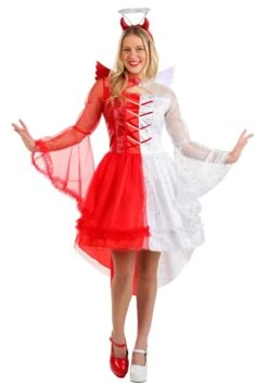 The Women’s Angelic Devil Costume is for those moments when you can’t decide if you want to bless the party or set it on fire (metaphorically… probably). This split-personality outfit brings both sides to the table—fiery devil red on one half, radiant angel white on the other—so you don’t have to choose between virtue and villainy. It’s equal parts sass and grace, wrapped up in one seriously eye-catching package.
