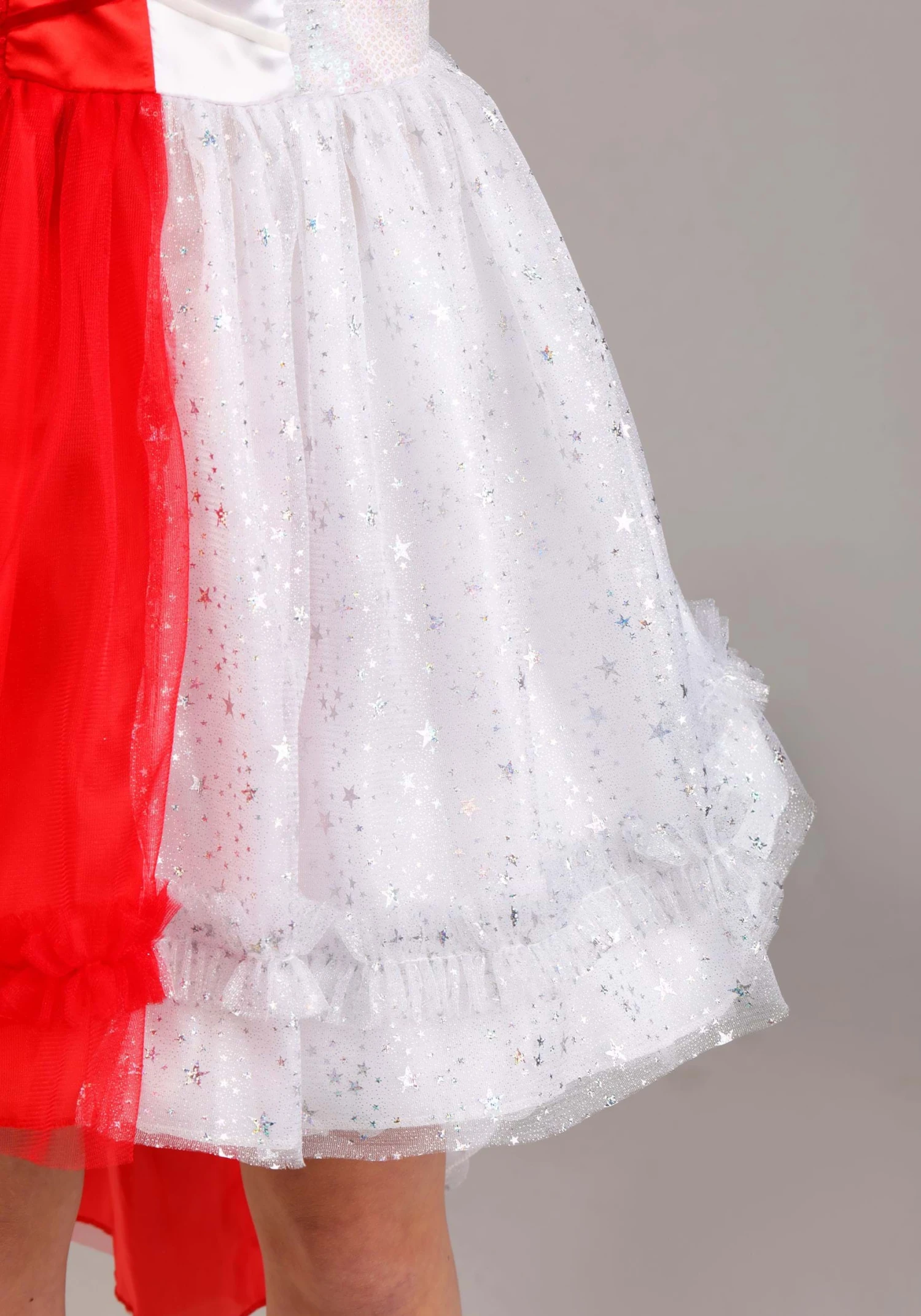 The dress is crafted from sleek satin, with one side dripping in devil-red drama and the other glowing in pure, shimmering white. Mesh, billowy sleeves create an ethereal silhouette, perfect for angelic twirls or devilish flourishes. Sequins along the sides catch the light, so no matter which side you’re showing, you’re sparkling.