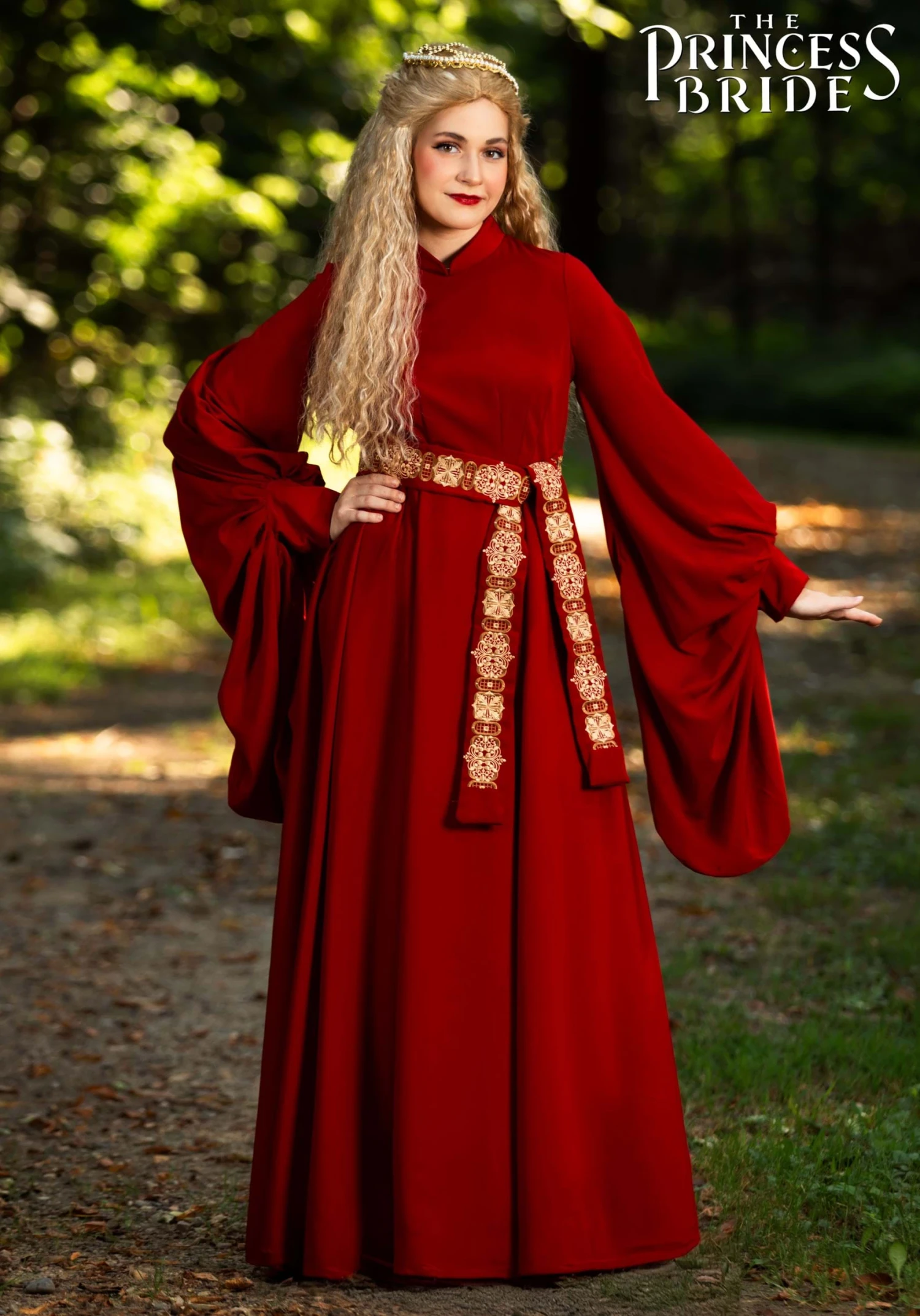 Straight out of The Princess Bride, this licensed Princess Buttercup gown is elegant and rich with details created by our very own, in-house design team. Inspired by the dress Buttercup was wearing during her kidnapping, it features long red, billowy sleeves with a gathered cuff. It has a high neckline and falls into a loose, pleated skirt. the dress is tied off at the waist with a gold pattern belt. The dress is topped off by the beaded crown that we all fawned over as kids (that couldn’t just be us, right?).