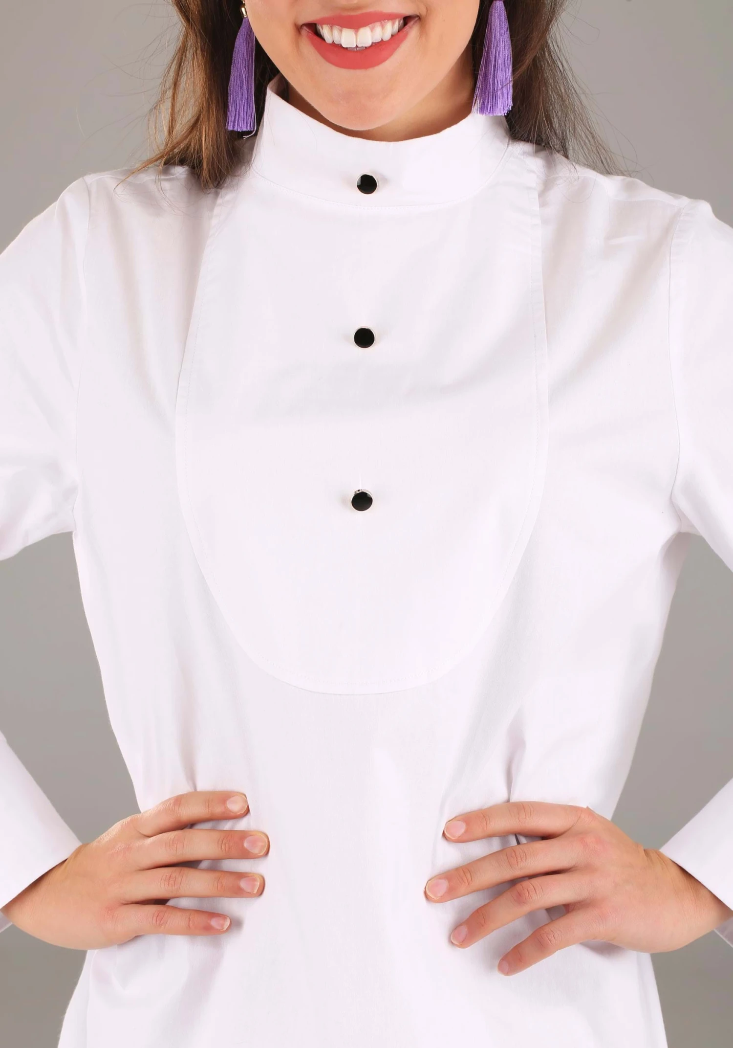 A far cry from the usual sweats you wear to bed, this exclusive costume is an exact replica of Holly’s alluring and elegant sleeping ensemble, crafted in our very own costume studio. It’s a tuxedo-inspired, oversized sleep shirt with black values, a stand-up collar, and side slits.