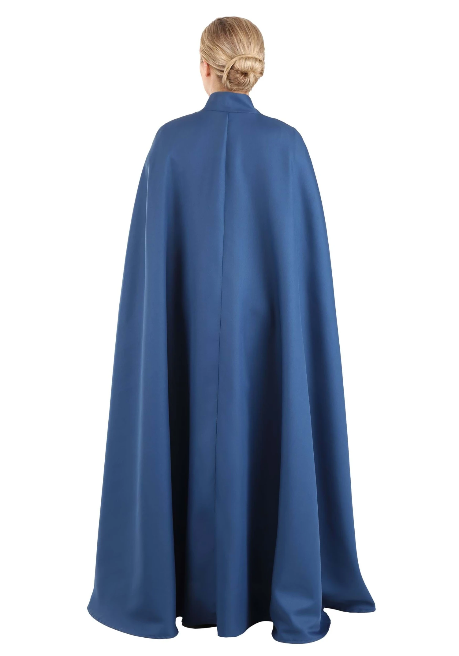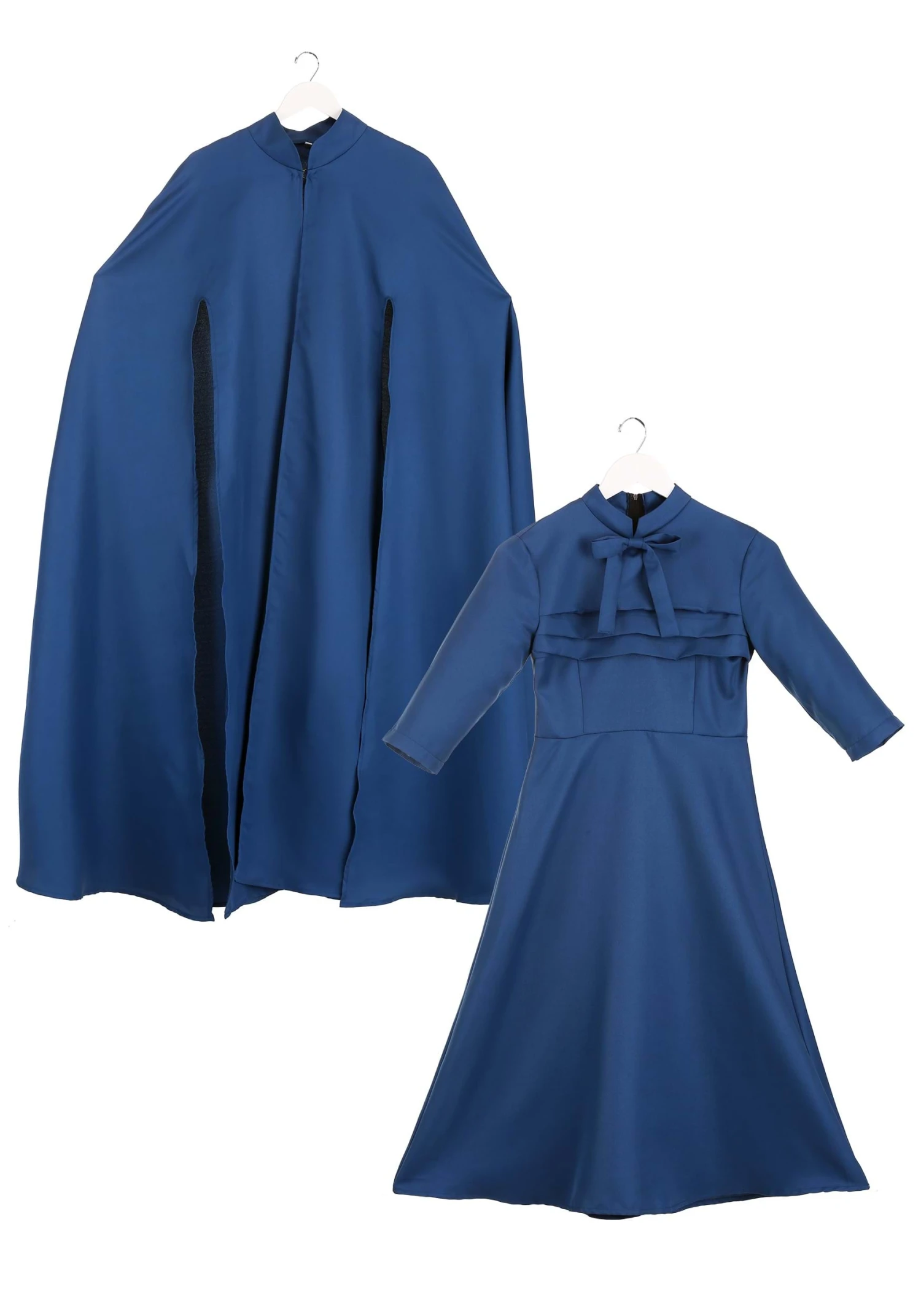 Designed by our in-house creative team, this Wife of Gilead costume from Handmaid’s Tale will bring yet another element of the dystopian nightmare to life! The costume features a modest tea-length dress that zips up the back. The dress has three-quarter length sleeves and a bow at the high-neck. A blue cape is layered over the top, securing at the neck with a hook and eye closure and allowing your hands to move freely with the slits at the sides. Pair this costume with tall boots and a stern gaze to complete this unsettling yet iconic look!